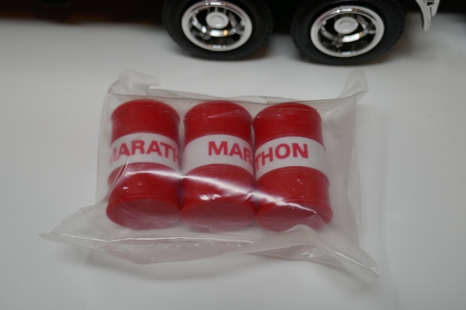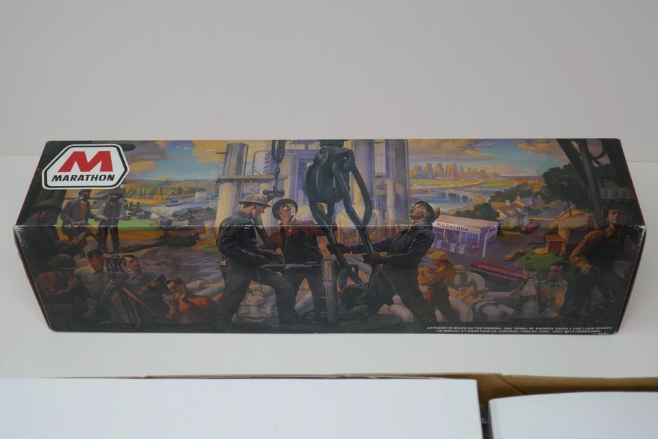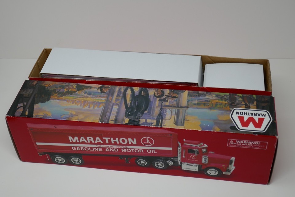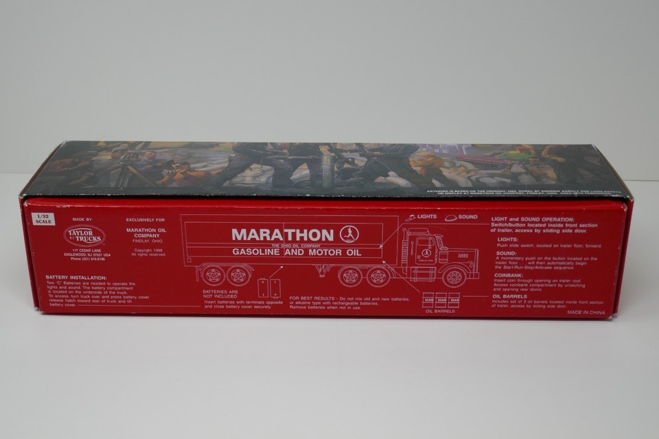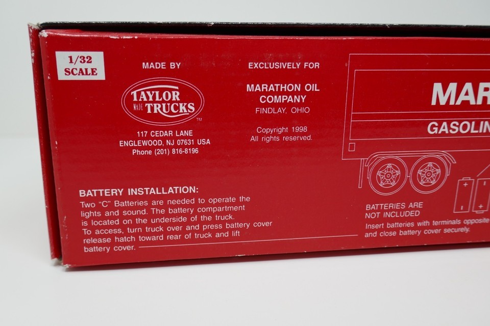 The Taylor Made Trucks 1998 Credit Card Edition Marathon Box Trailer Truck is a limited edition toy vehicle featuring a 1:32 scale plastic model of a red tractor trailer. This limited edition vehicle is numbered 2157 of 4488 and removed from the box for pictures. With its advertising specimen features and freight truck model, this toy is sure to appeal to both boys and girls who enjoy playing with detailed and realistic vehicles.