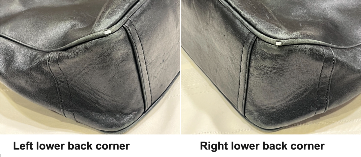 The exterior shows light scuffs and color loss. The trim corners and around the front flap show light color loss and minor scuffing. The piping on the lower back corners has worn through. (See pictures.) The leather on one side of the top handle has separated although the handle itself is fully usable. The interior is clean, stain and odor free.