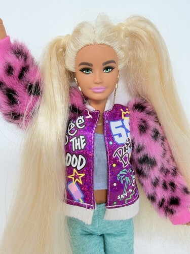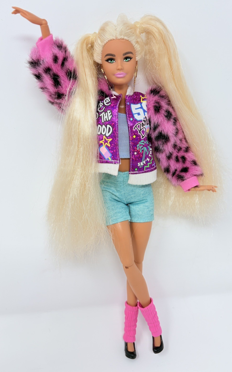 Barbie Extra Number 8 Doll Blonde Pigtails Pink Varsity Jacket Dressed