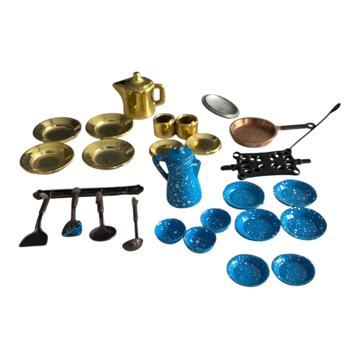 Vintage Dollhouse Miniature Kitchen Lot Metal Enamelware Cookware Gold Plastic Dishes 1:12 Scale