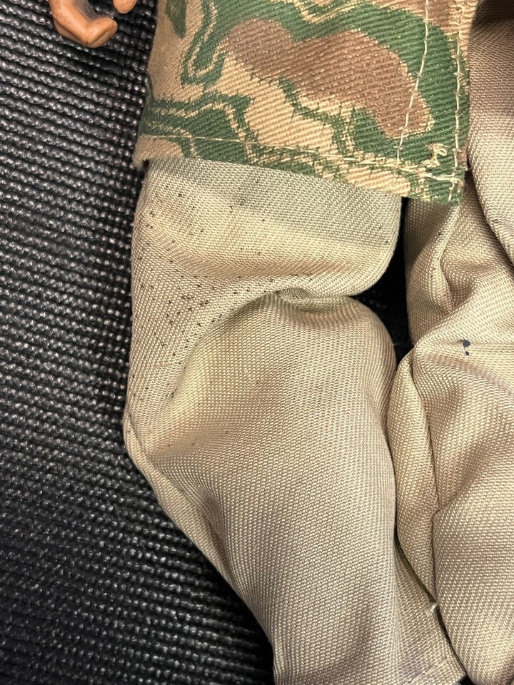 The item does have some black specks on the pants and does not come with original packaging. Please see photos for what you see is what you will receive.