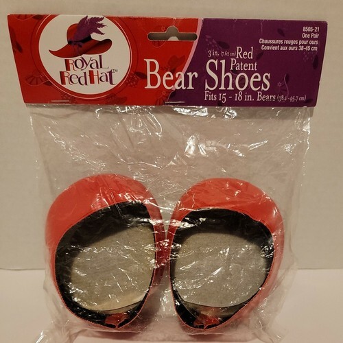 The Royal Red Hat Red Patent Bear Shoes are a set of two red patent leather shoes designed to fit 15-18 inch bears. Made by the brand Royal Red Hat, these shoes are crafted specifically for bears and are a perfect accessory for doll and bear enthusiasts. The vibrant red color and sleek design make these shoes a stylish addition to any bear's wardrobe, ideal for adding a touch of flair to their outfit. Made in China, these bear shoes are a must-have for those looking to dress up their furry friends in style.