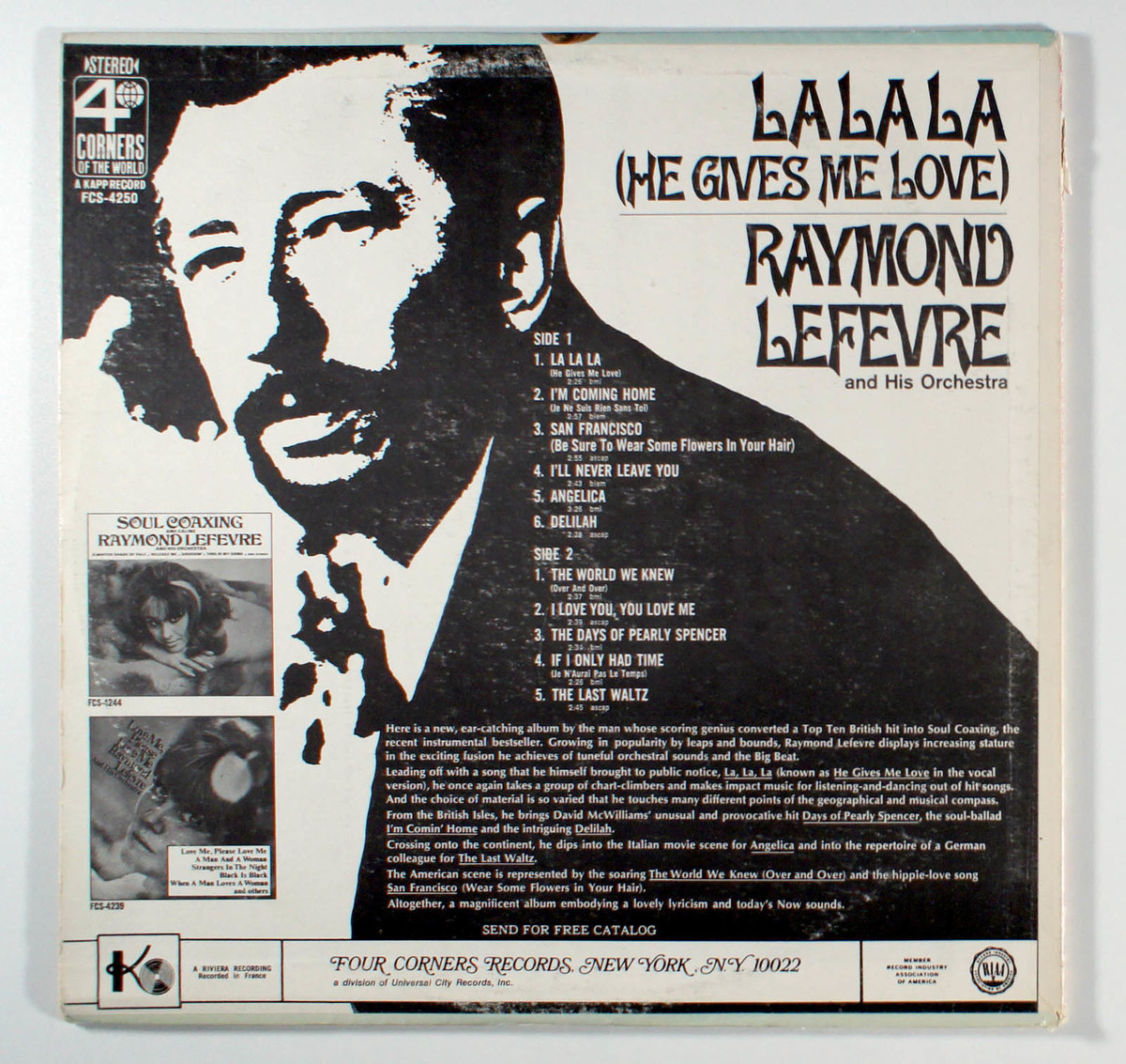 La La La (He Gives Me Love), by Raymond Lefvre and His Orchestra, is a captivating orchestral easy-listening compilation that opens with an instrumental rendition of the 1968 Eurovision-winning Spanish entry La La La as its titular highlight, surrounded by lush arrangements of late-1960s international pop hits like Delilah, San Francisco (Be Sure To Wear Some Flowers In Your Hair), and The Last Waltz. Recorded in France and featuring Lefvre's signature grand orchestra blending symphonic strings with big-band flair, the album transforms vocal sensations into dreamy, cinematic instrumentals that evoke the era's romantic pop sophistication. A unique aspect is its status as a Riviera recording licensed for U.S. release, showcasing Lefvre's prowess in adapting global chart-toppers for easy-listening audiences shortly after their original debuts. Historically significant for capturing the Eurovision buzz and the transatlantic flow of pop in 1968, it includes covers such as The World We Knew (Over And Over) and If I Only Had Time (Je N'Aurai Pas Le Temps), blending English and French influences seamlessly. Fan-favorites among collectors often highlight the buoyant La La La and the poignant Delilah, contributing to its enduring appeal.