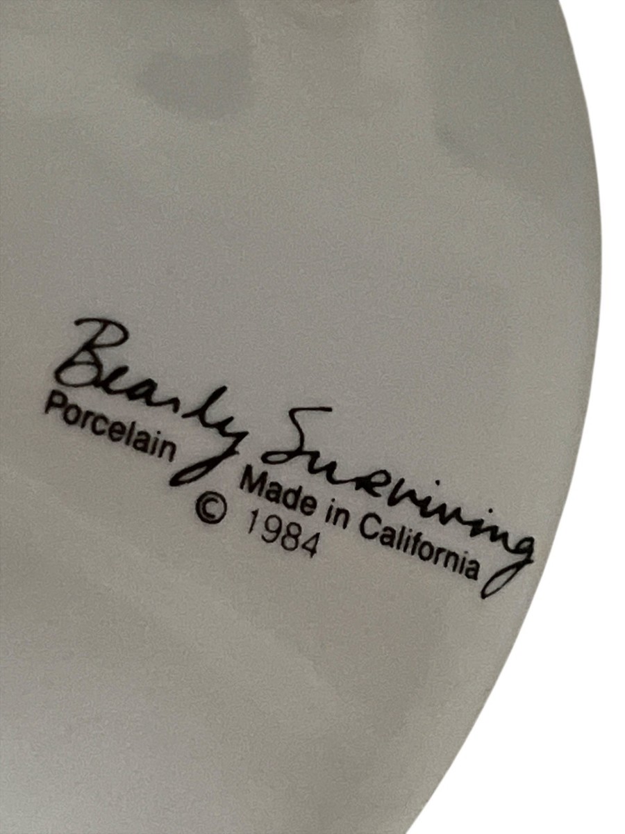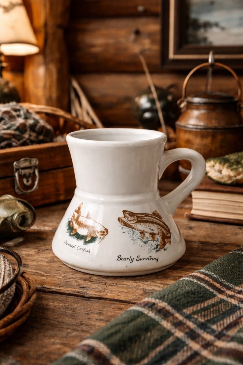 Vintage porcelain fishing-themed mug by Bearly Surviving, featuring detailed fish illustrations including Largemouth Bass, Channel Catfish, and Rainbow Trout. Made in California and dated 1984, this mug has a distinctive flared shape and a classic outdoorsman aesthetic. A great piece for anglers, cabin decor, or vintage kitchen collections.