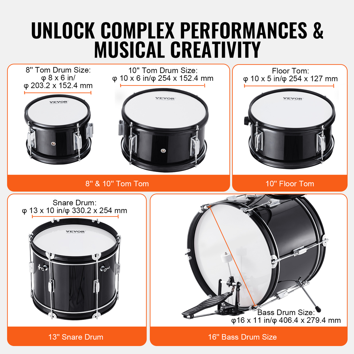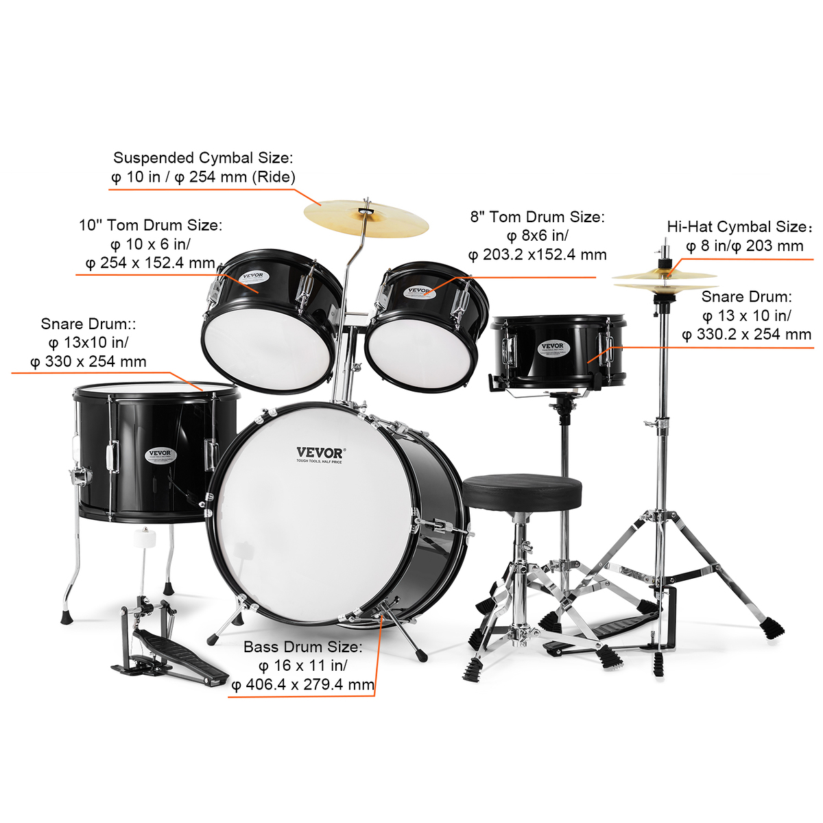 5-Piece Beginner-to-Pro Drum Set: Our drum set is the perfect companion for your child's musical journey from beginner to pro! It includes a 16'' bass drum with a pedal, a 10'' snare drum, 8'' 10'' tom-toms, and a 13" floor tom, along with a 10'' suspended cymbal and an 8'' hi-hat cymbal with stand, allowing children to explore more complex rhythms and unleash their creativity in music composition. Give your child the tools they need to rock the stage!