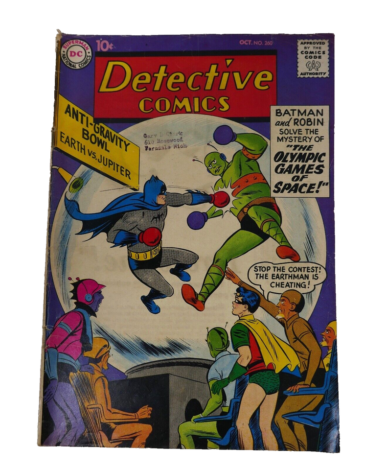Up for sale is a D.C. Comics 1958 Detective Comics #260 Comic Book. These vintage books have wear to the cover and edges as well as a name stamped on the front. This is a Sheldon Moldoff, Ruben Moreira, and Joe Certa art, Curt Swan and Stan Kaye cover.