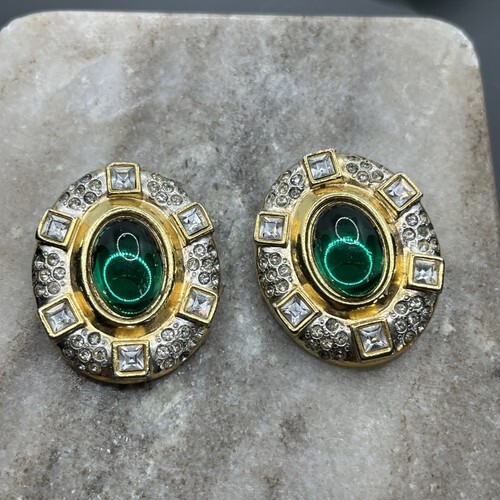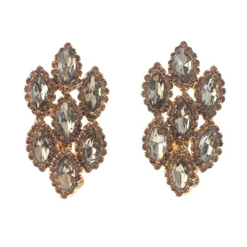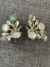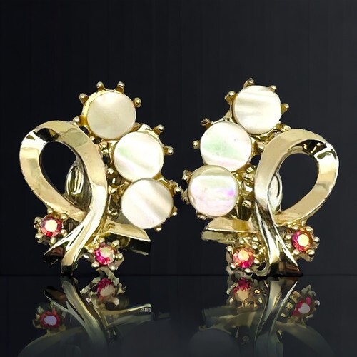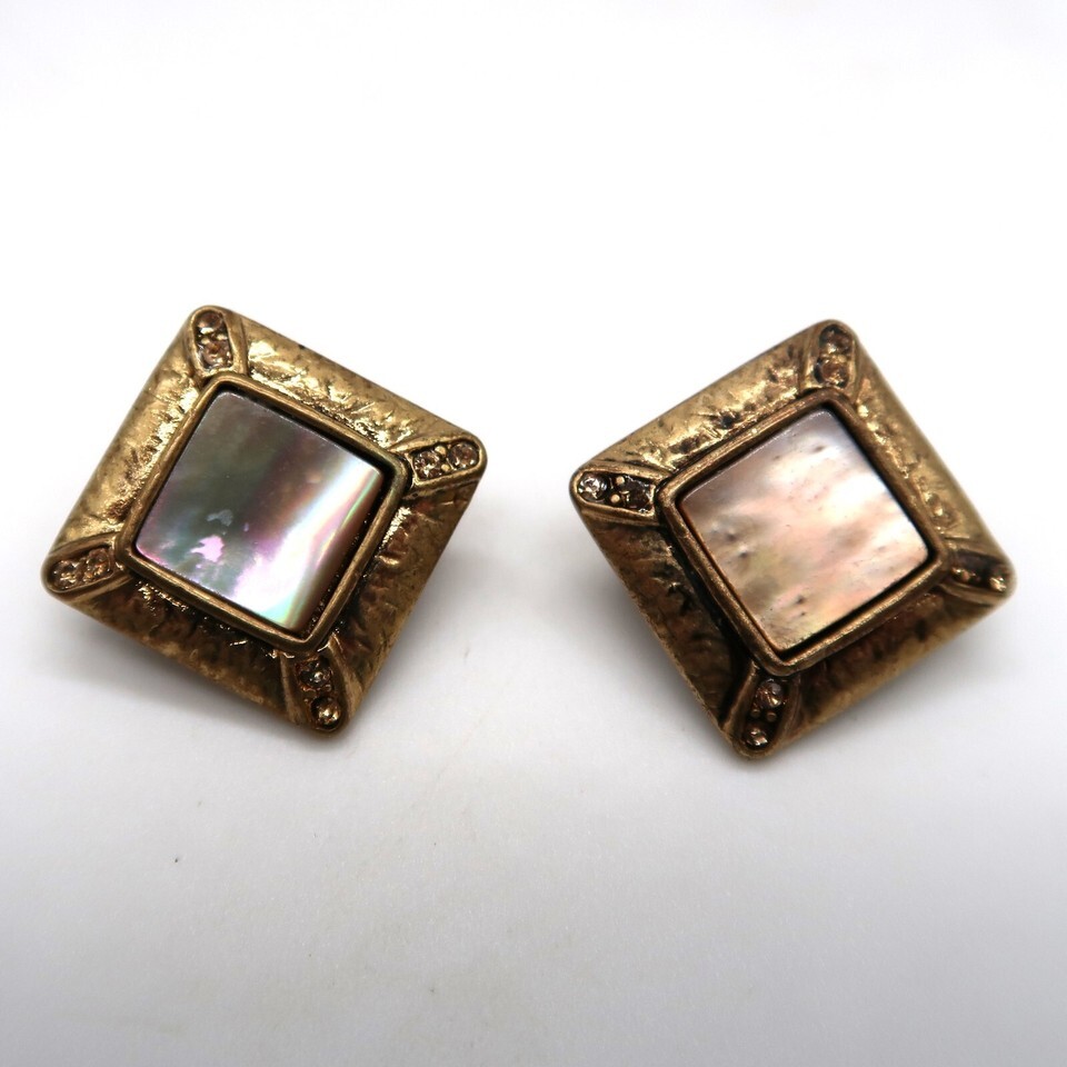 Vtg gold tone mother of pearl diamond shaped clip on earrings rhinestone accents