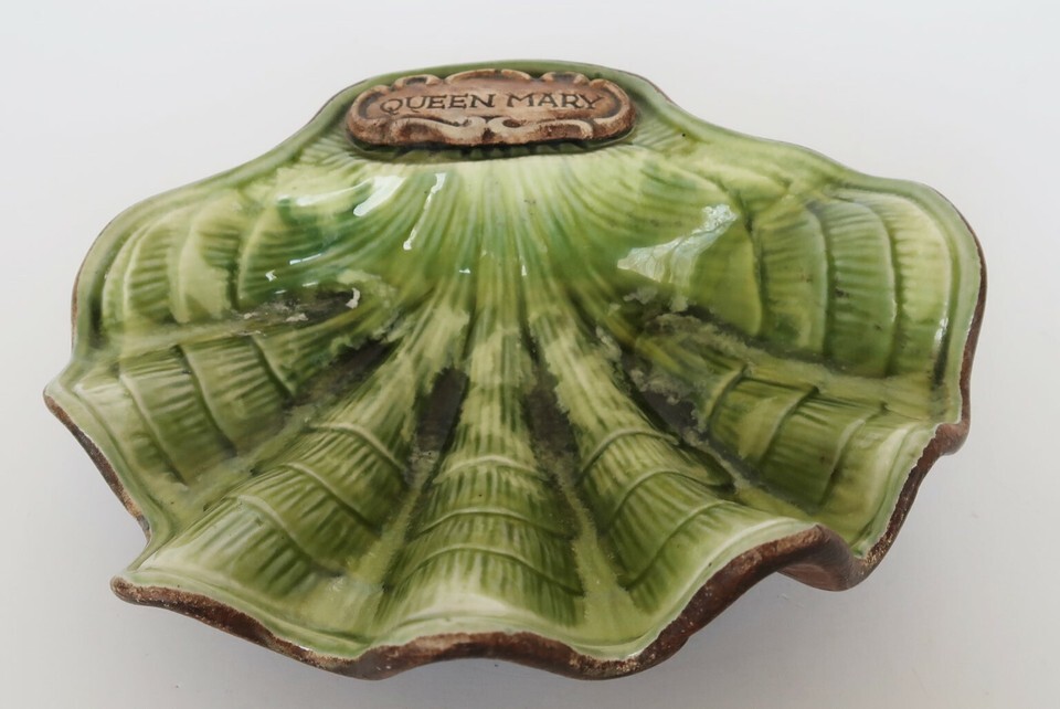 Vintage Treasure Craft Queen Mary Ceramic Souvenir Green Clam Shell Trinket Dish