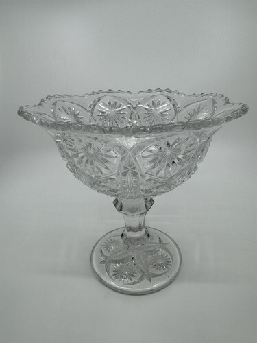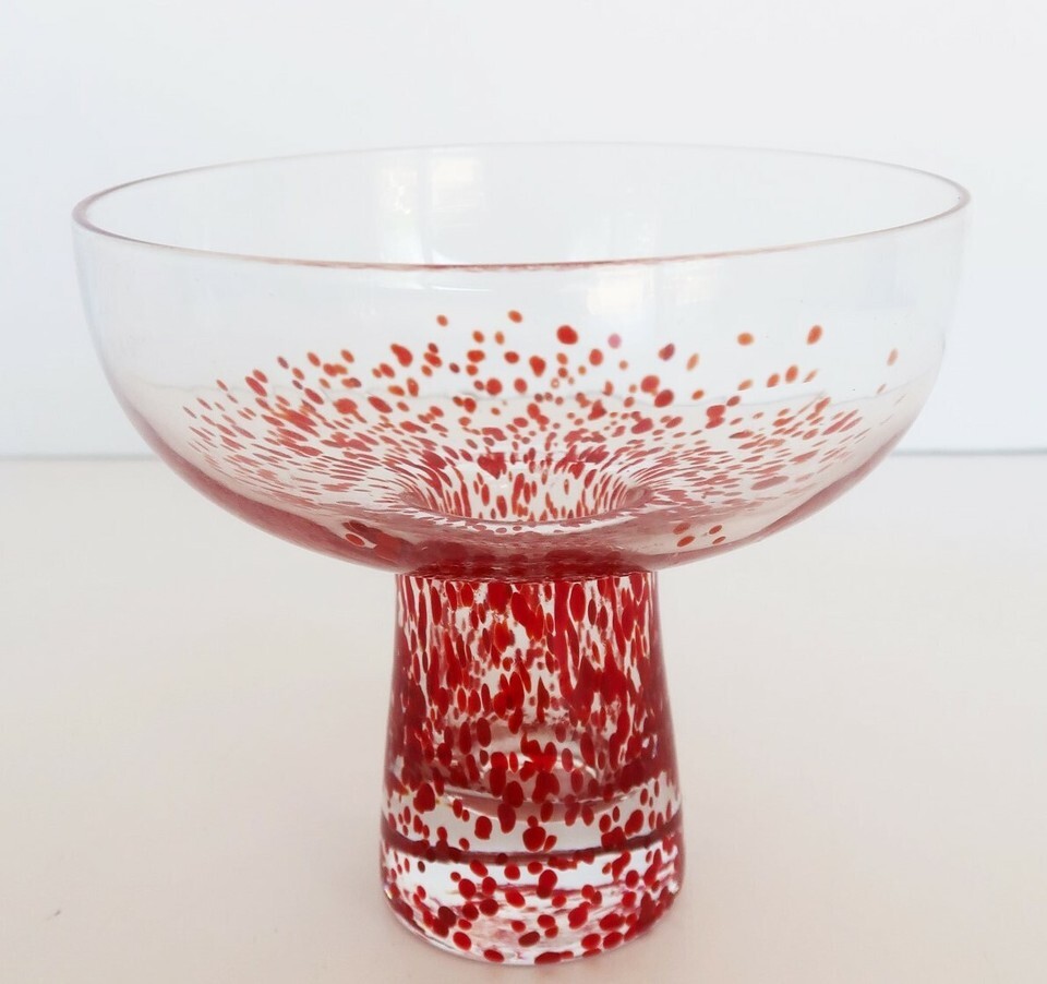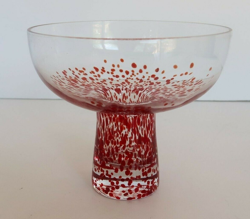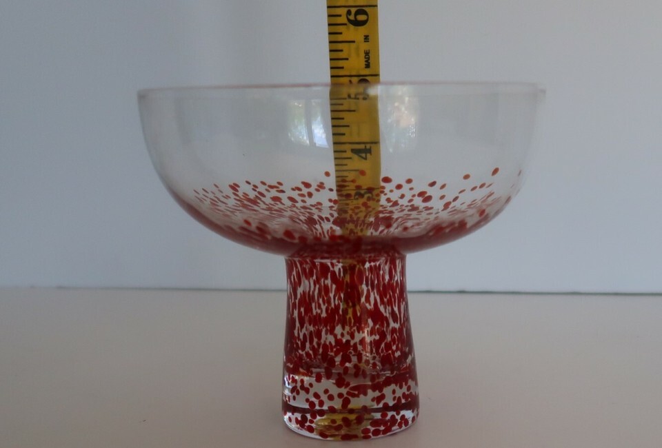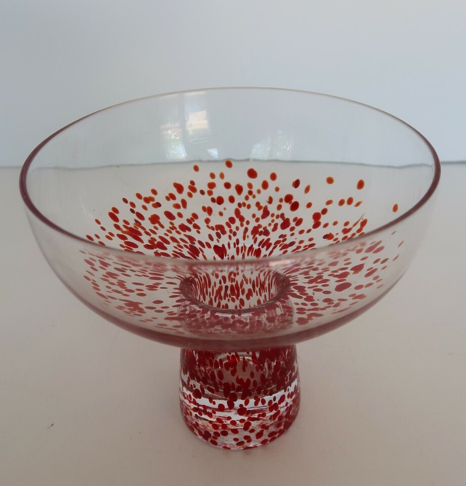 Vintage clear art glass footed pedestal candy dish with red spotted details