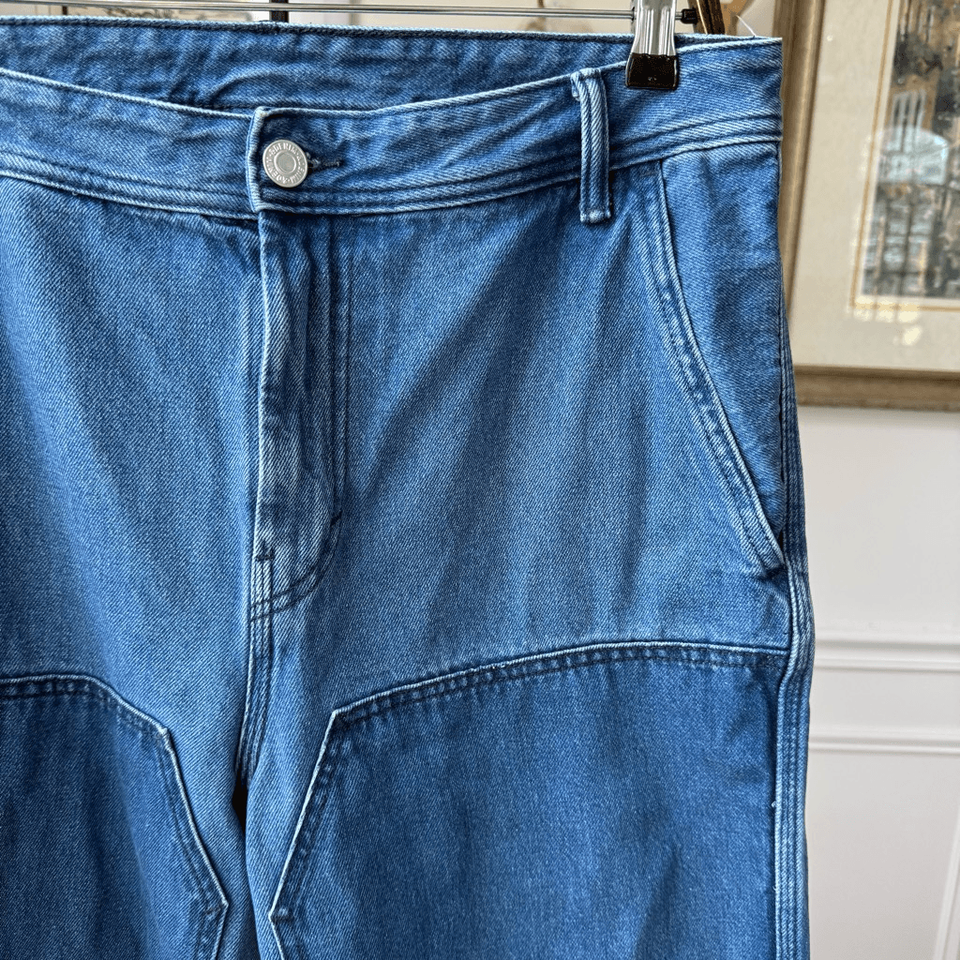 5-pocket jeans in sturdy cotton denim. Loose fit with a regular waist, zip fly and button and large knee patches. The knee patches are slightly darker blue than the rest of the denim. Tag size 32 x 32 however, these have been machine washed and the inseam is now 29 inches which is too short for us. Barely worn. Laying flat measures 17 inches straight across the waist with a 12.5 inch rise. Button and zip closure.