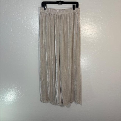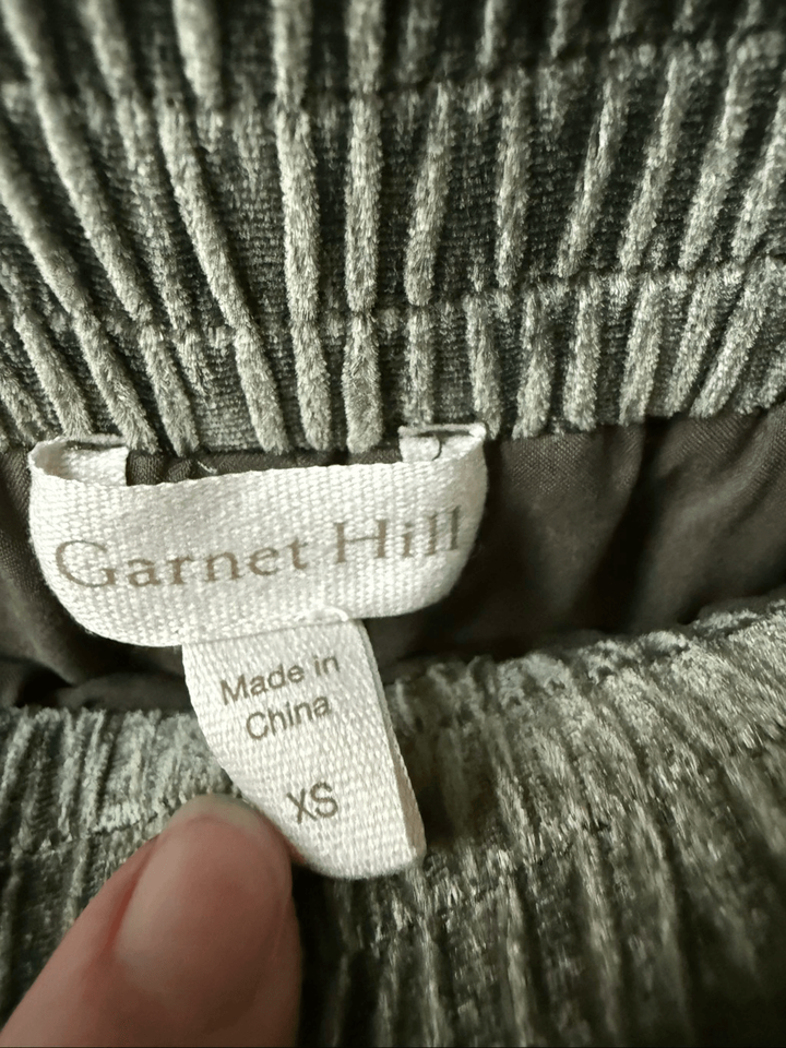 Sadly, I have outgrown my favorite wide leg, silk and rayon blend velvet pull on pants with elastic waist. There was a drawstring, but the drawstring is gone. It?s not necessary for wear. Hip pockets. The color is a beautiful shade of mossy, Ivy Green. The fluid drape of the velvet is flattering tag size extra small. Please note the fabric content tag is clipped because it was pokey, but I have more than one pair of these so I can confirm the fabric content. Laying flat measures 14 inches straight across the waist with an 11 inch rise and a 31.5 inch in. The leg opening measures 12 inches straight across.