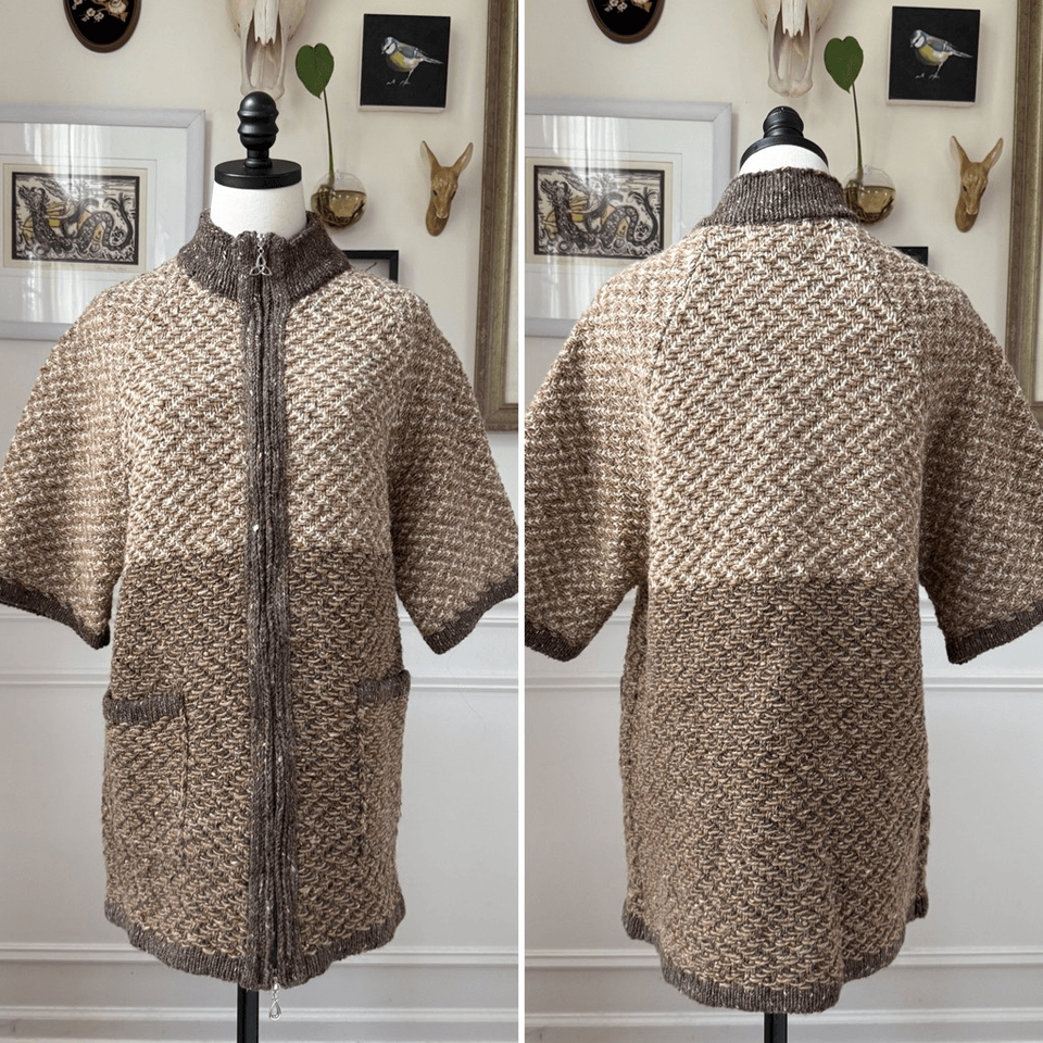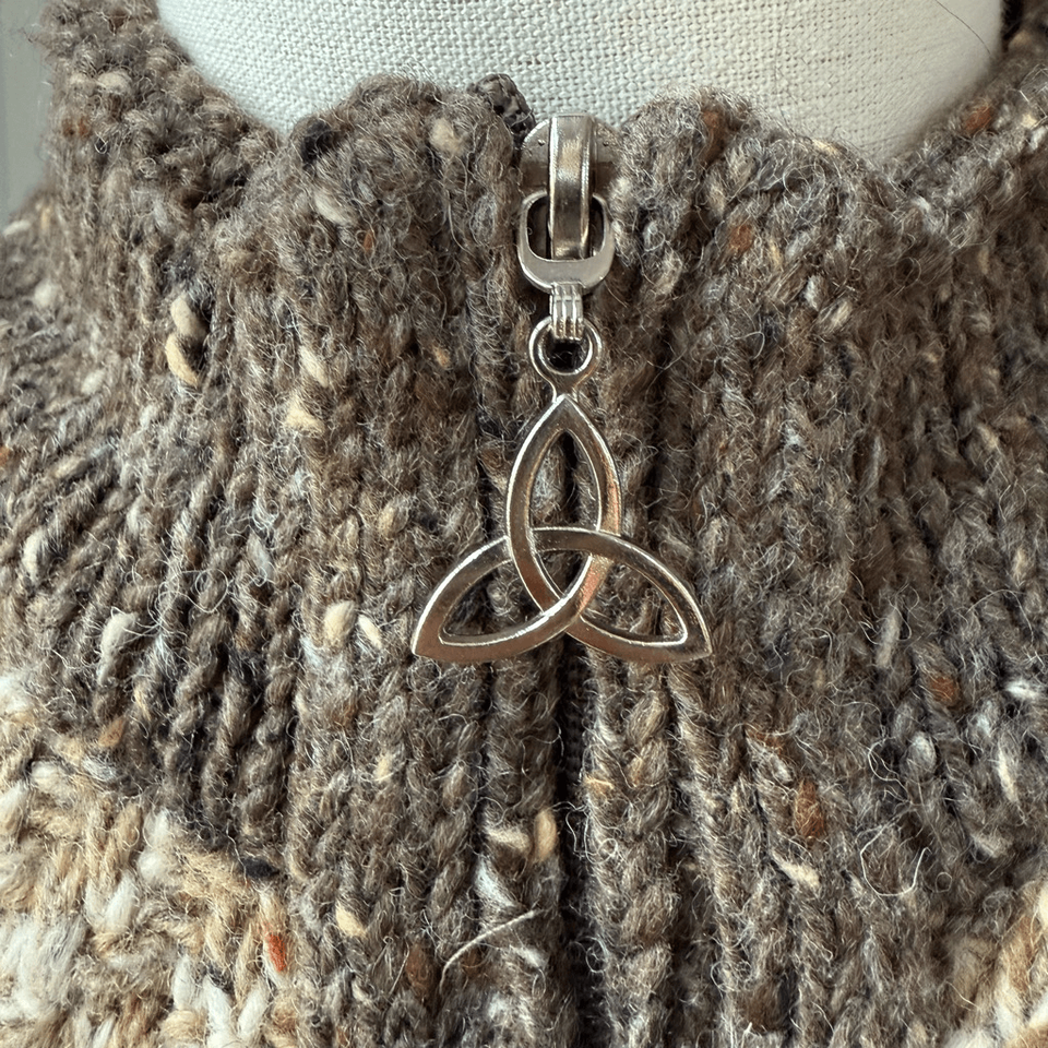 women?s Aran Crafts 100% wool Irish full zip sweater. Half sleeves. Brown and tan colorblock scheme. 2 way Celtic knot symbol zipper accent. 2 external pouch pockets. Size medium. Measures approx. 20? pit to pit (flat) and 31? shoulder to hem. No flaws noted