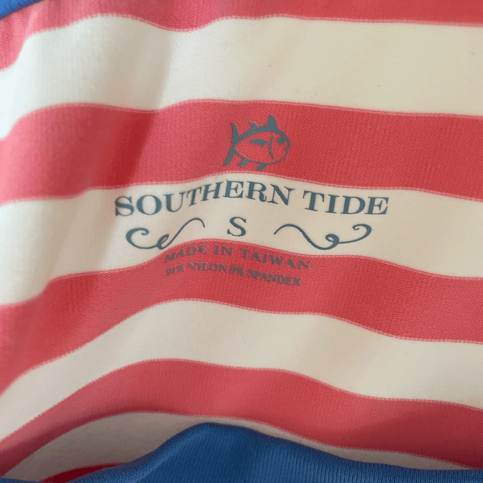 Southern Tide pink and white stripe t-shirt dress with blue trim and embroidered southern tide fish logo stitched into the hem. A springing nylon and spandex blend. Laying flat measures 18 inches armpit to armpit, 18 inches straight across the waist and 36 inches shoulder to hem