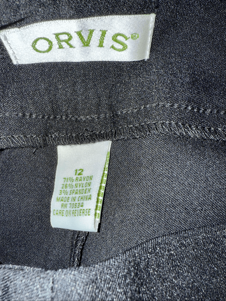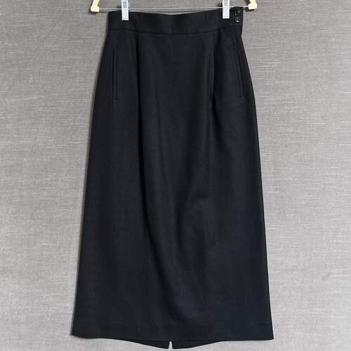 Orvis women?s black rayon, nylon and spandex blend pull on pencil skirt with wide band waist and small vent in the back center for easy movement. Laying flat measures 17 inches straight across the waist, 21.25 inches across the hip and 21 inches long. Classic wardrobe, staple capsule wardrobe.