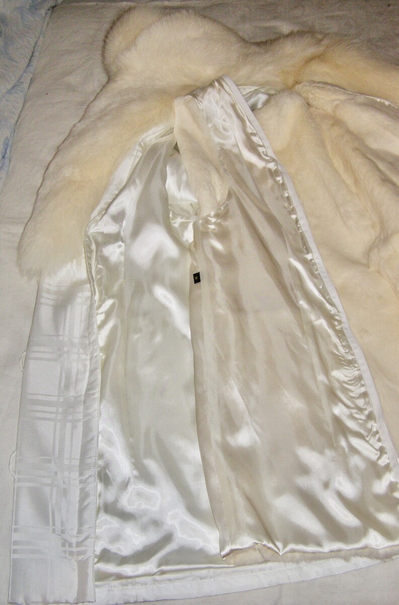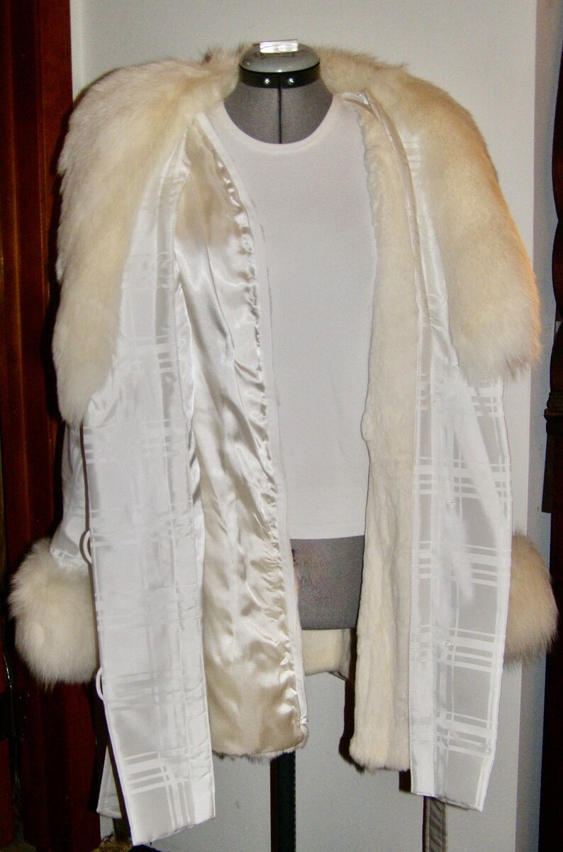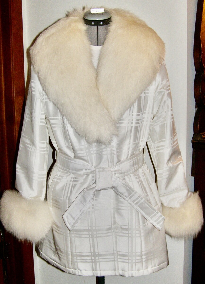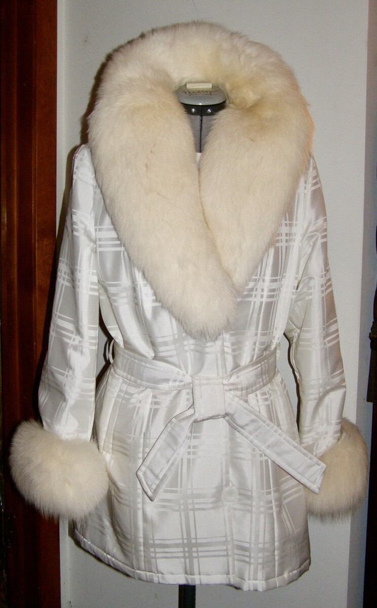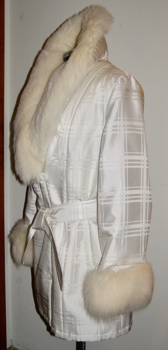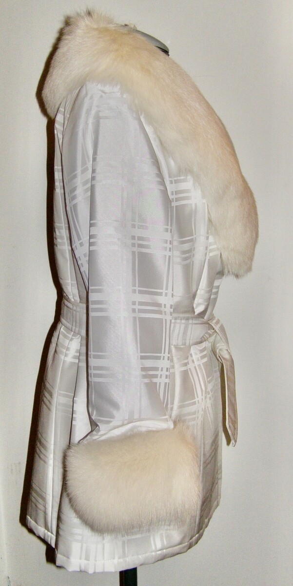VINT. SAGA FURS ‘WINTER WHITE’ WOVEN FABRIC BELTED COAT w/FOX FUR COLLAR + CUFFS