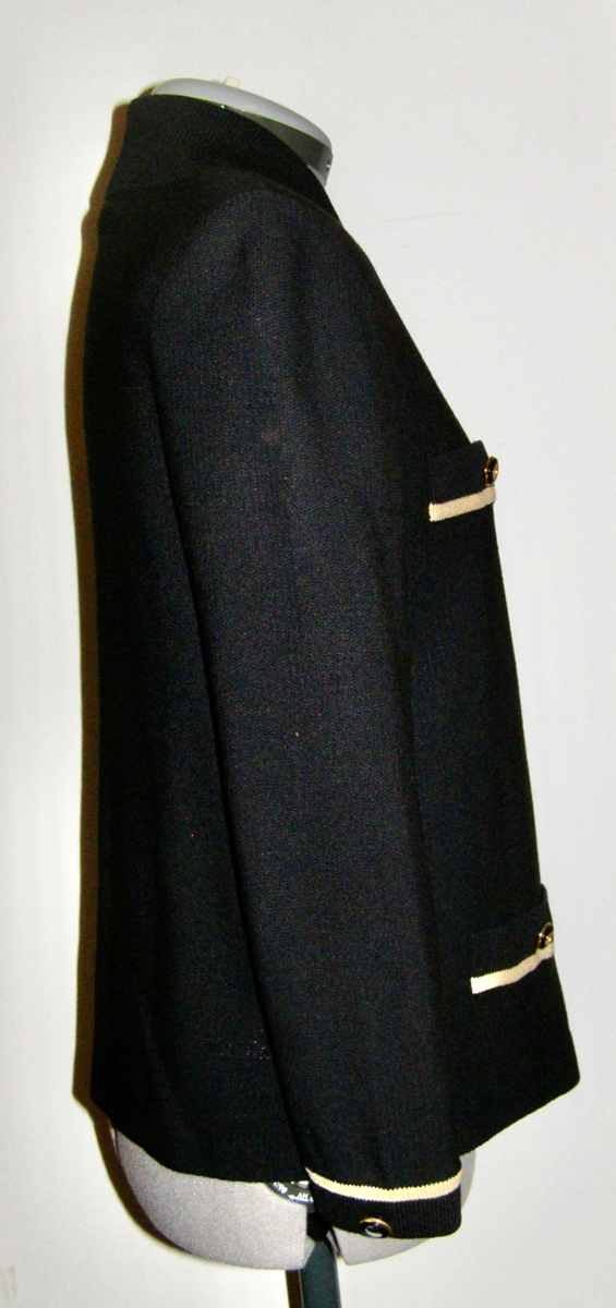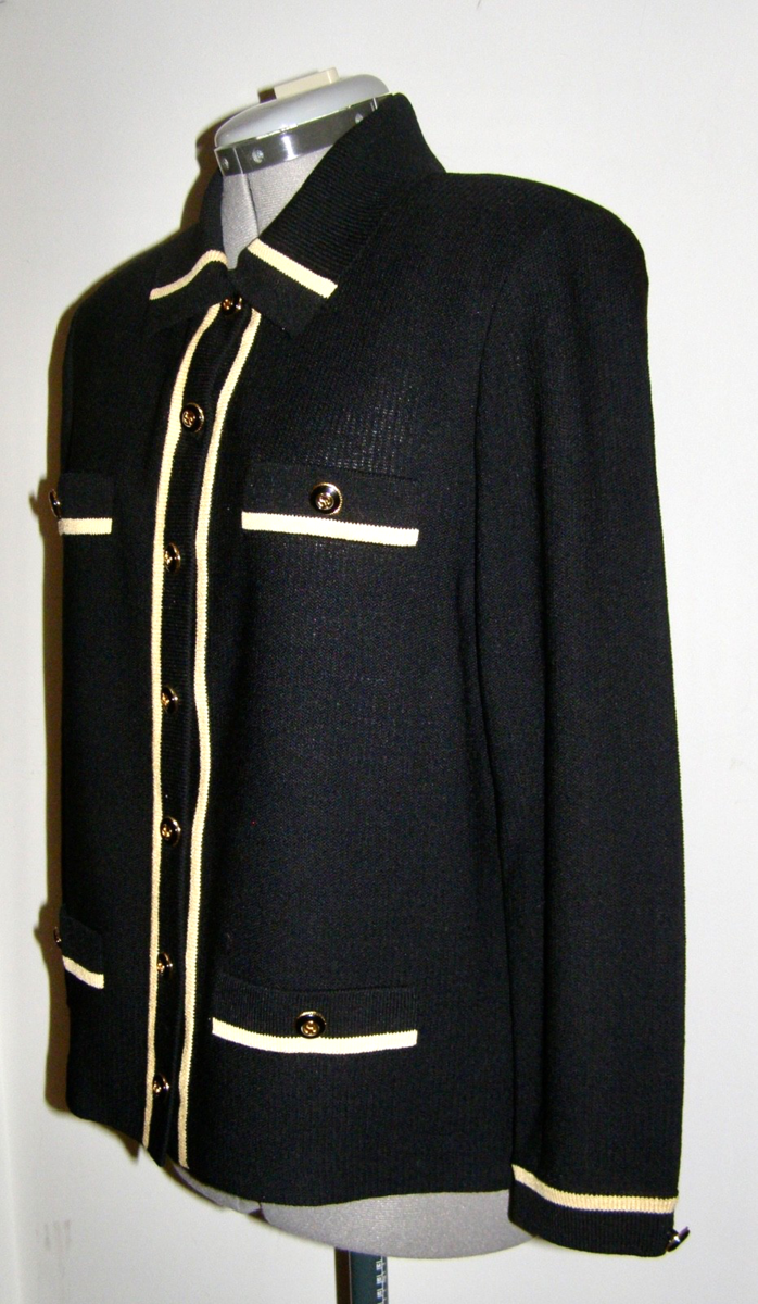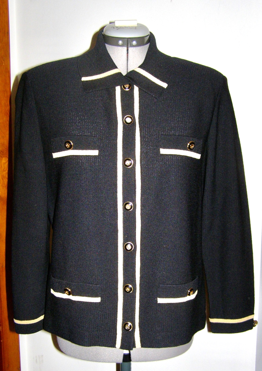 VINTAGE “ST. JOHN COLLECTION by MARIE GRAY” BLACK KNIT JACKET w/ BEIGE KNIT TRIM