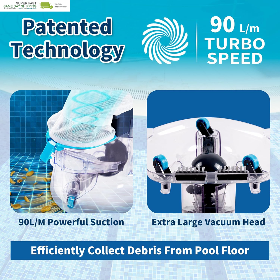 [Patented Suction Technology]: Equipped with a large vacuum head and innovative patented suction technology, the PoolCent vacuum operates at an impressive turbo speed of 24 GPM,. It efficiently and quietly removes leaves, delivering superior cleaning performance.