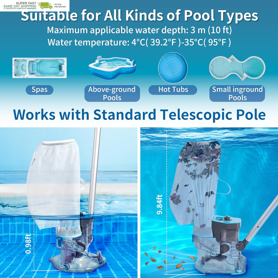 [Universal Versatile]: The PoolCent handheld pool cleaner is designed for both above-ground and in-ground pools, as well as spas and hot tubs. Ideal for a maximum water depth of 10 ft (3 m), it delivers reliable cleaning performance across various water environments.