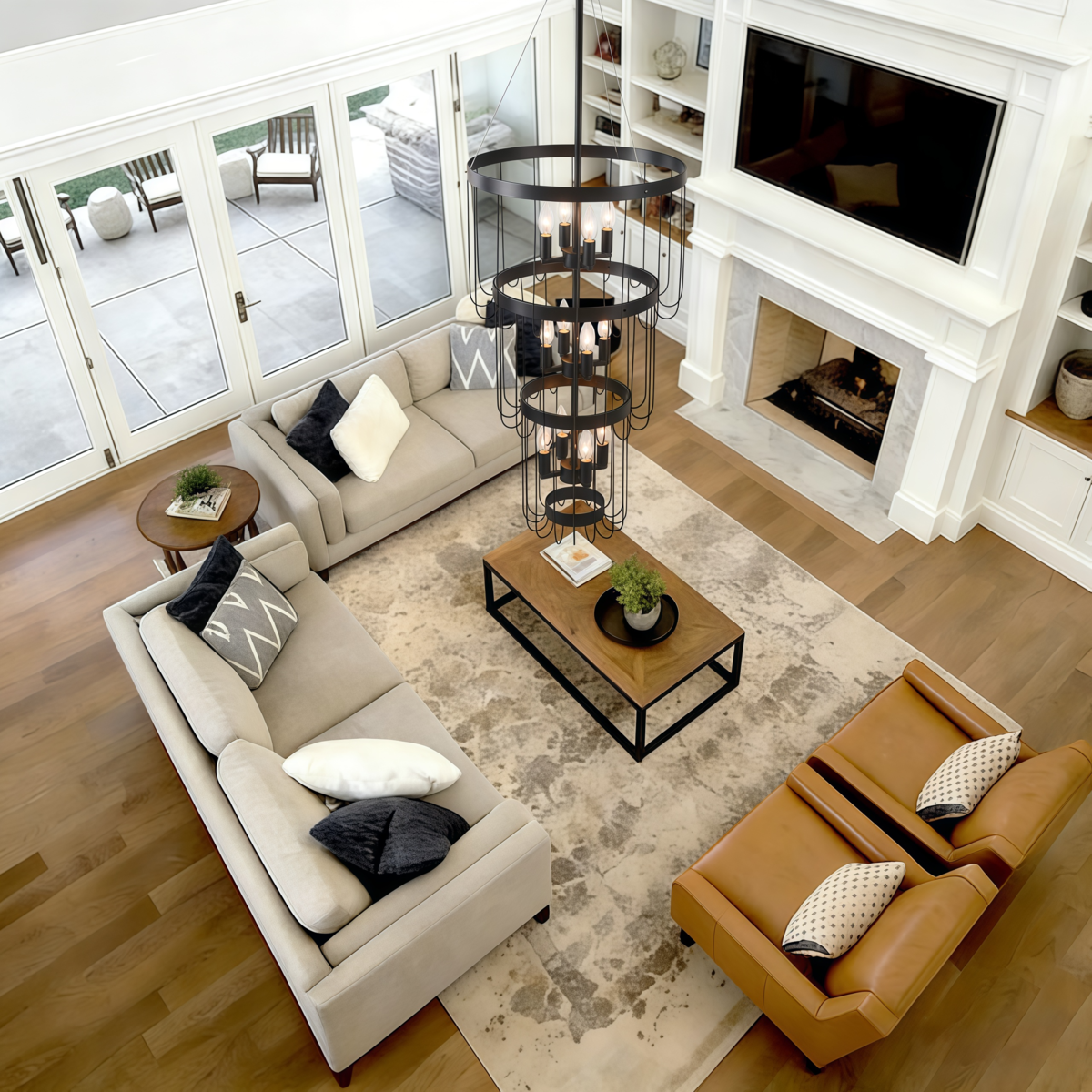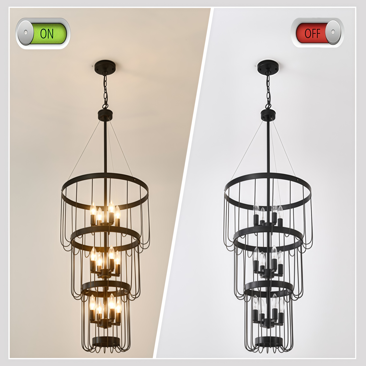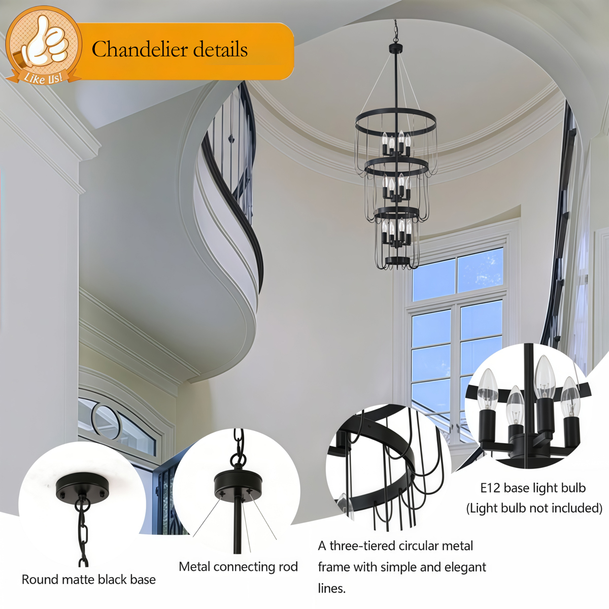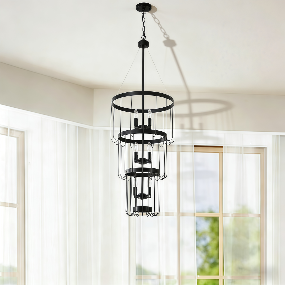 12-Light Black Candle Chandelier, Farmhouse 3-Tier Adjustable for Foyer,Stairs