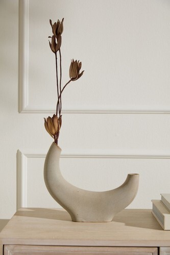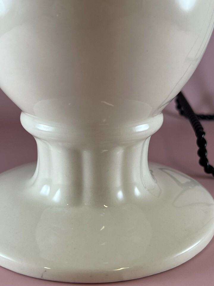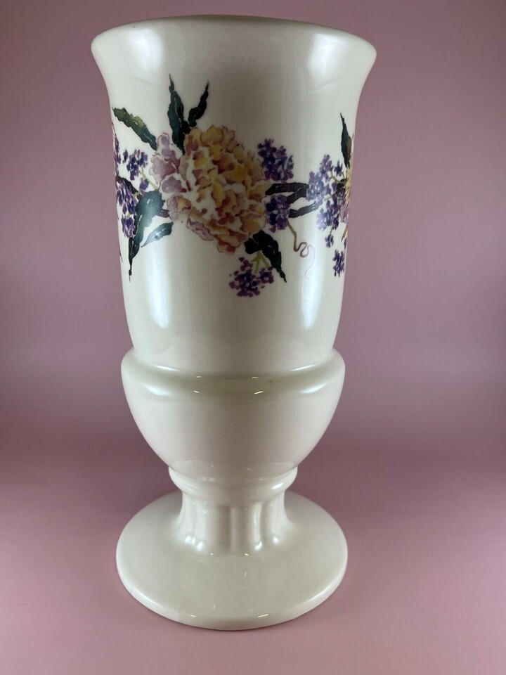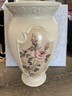 ceramic floral urn-shaped vase. The vase is cream color and has a floral design