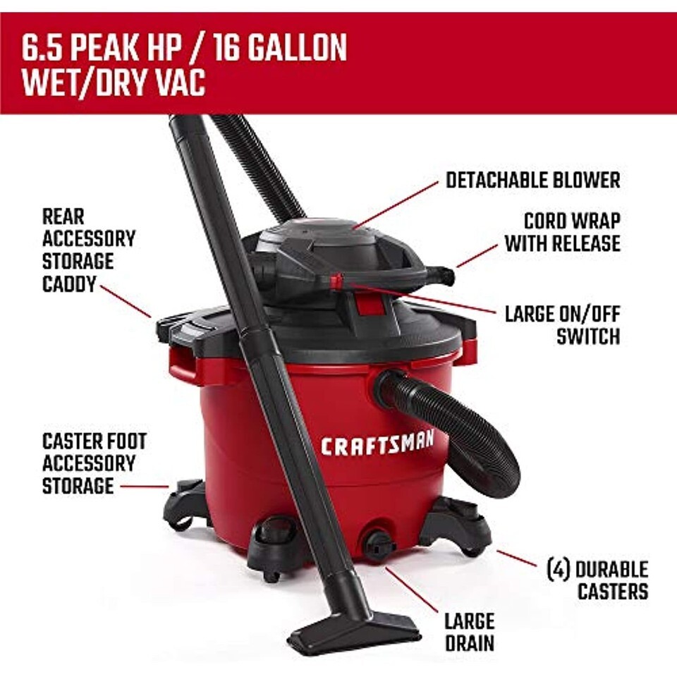 The CRAFTSMAN 16 gallon wet/dry vac, featuring our most powerful 6.5 Peak HP motor plus a detachable blower, is great for tackling large cleanup projects in the garage, shop and at the jobsite with the bonus of being two-tools-in-one. Take this vac from sucking up sawdust to blasting dirt from the shop floor in a snap. This shop vacuum features on-board hose storage plus accessory and power cord organizers that help eliminate unneeded hassle and reduce overall storage space. Dual-flex technology provides 180-degree flexibility at both hose ends for maneuverability in tight spaces, resisting kinks and crushing. The POS-I-LOCK hose connection provides secure attachment of hose to vac drum and won't pull loose during use. Equipped with an extra-large drain, It quickly empties the tank of liquids. The Qwik Lock filter fastening system makes removing and installing wet dry vacuum filters quick, easy and Secure.