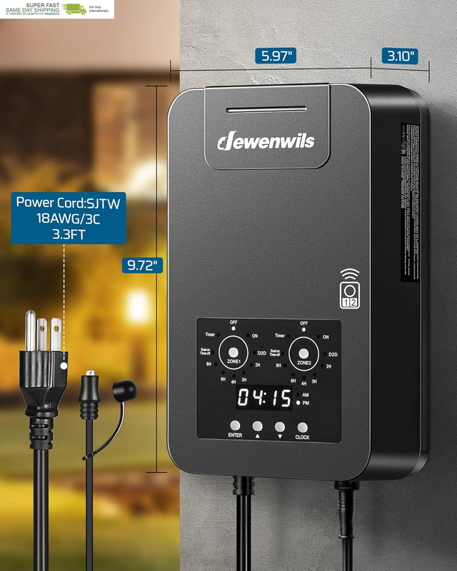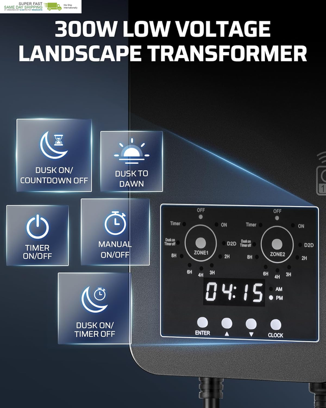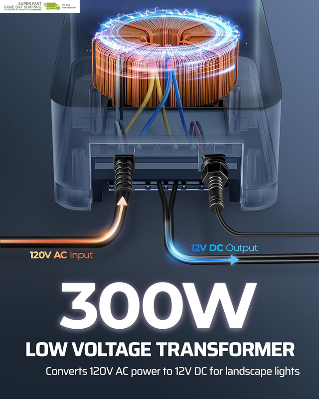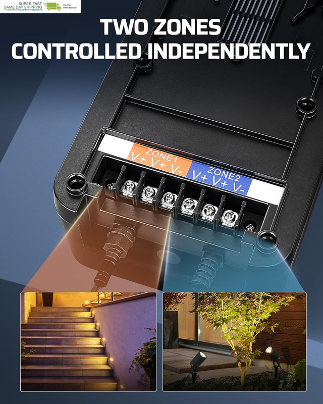 [Dual-Zone Control with 100FT Remote] Control 2 independent 300W lighting zones separately with different modes, while adjusting both from up to 100ft away; this upgraded landscape transformer is perfect for patios and gardens; included remote lets you switch modes or turn lights on/off without stepping outside