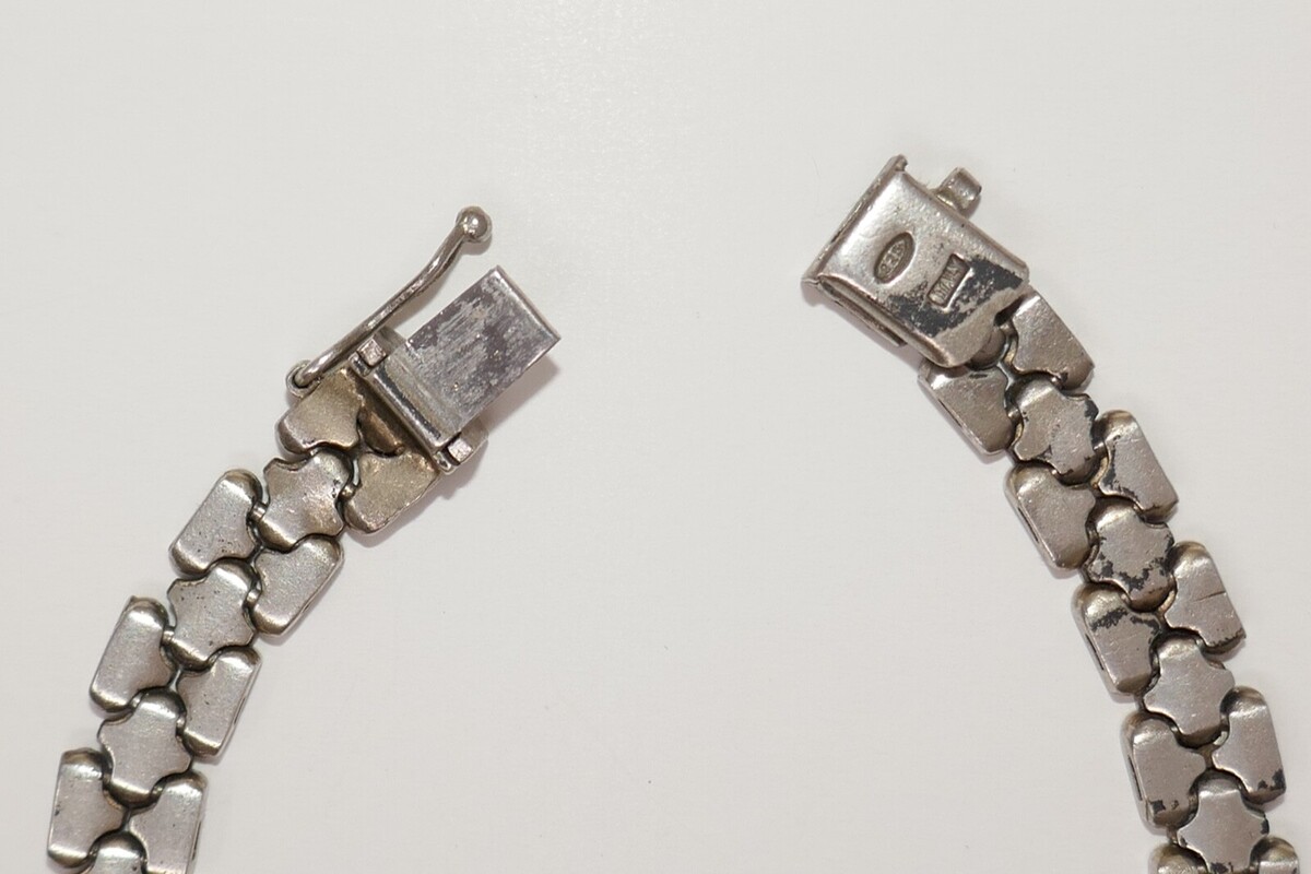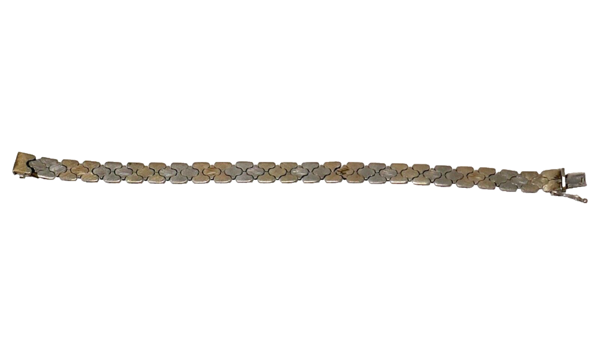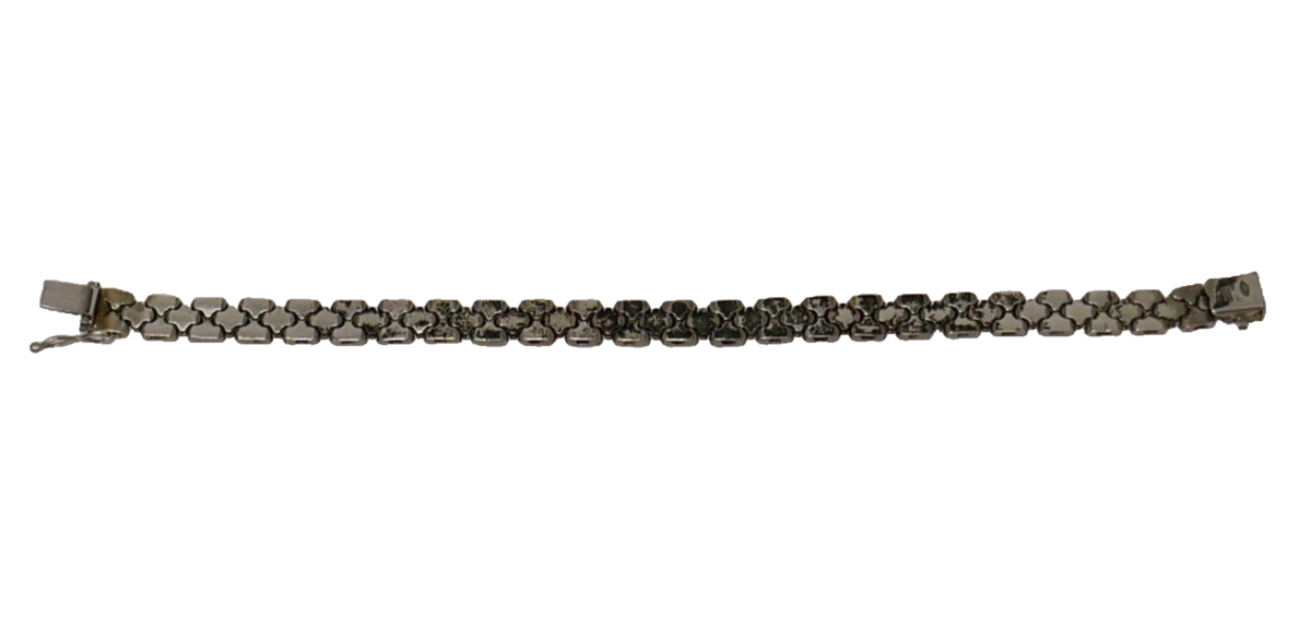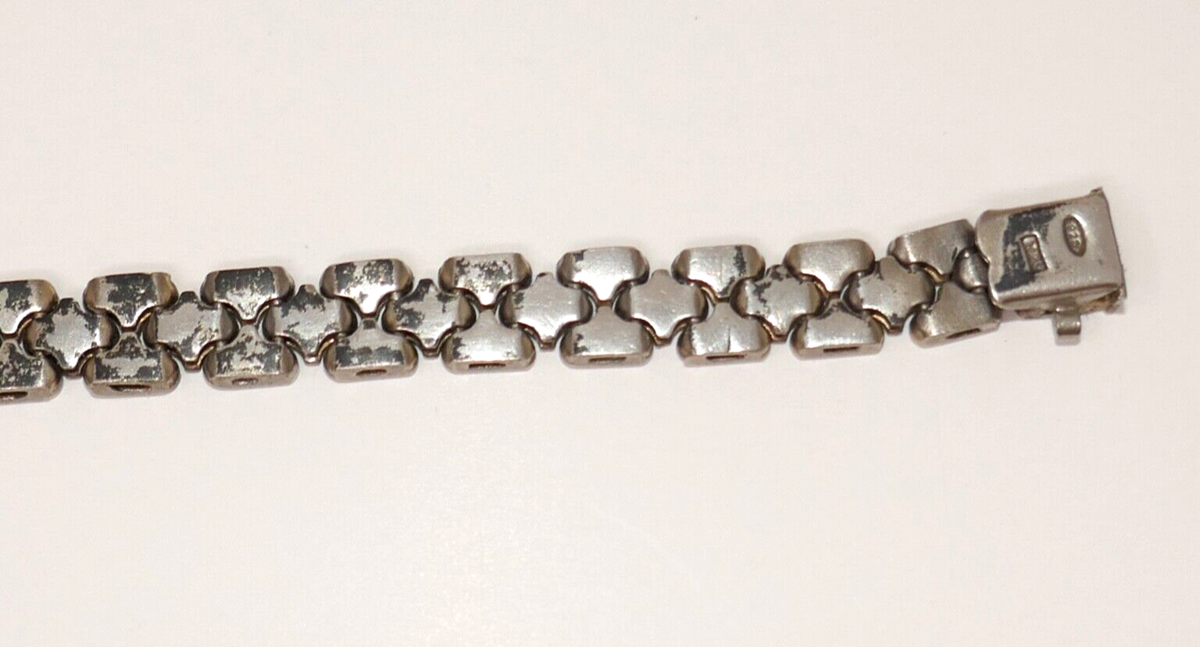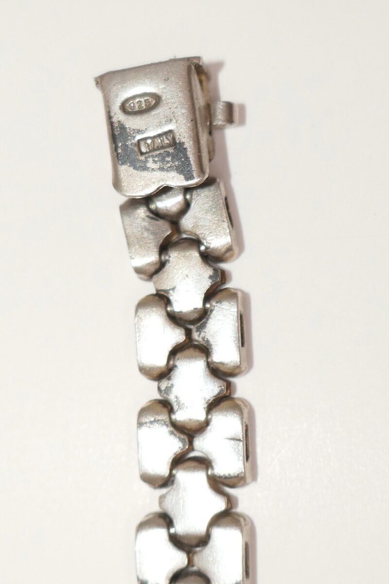 Get ready to add a touch of vintage elegance to your jewelry collection with this FMC 925 sterling silver bracelet. This fancy chain bracelet, made in Italy, features a textured design that is perfect for any occasion. Measuring 7.5 inches in length, this bracelet is perfect for those who love to add a touch of sophistication to their outfits. It is a perfect gift for someone who loves collecting vintage or antique jewelry. This does have some patina and wear.