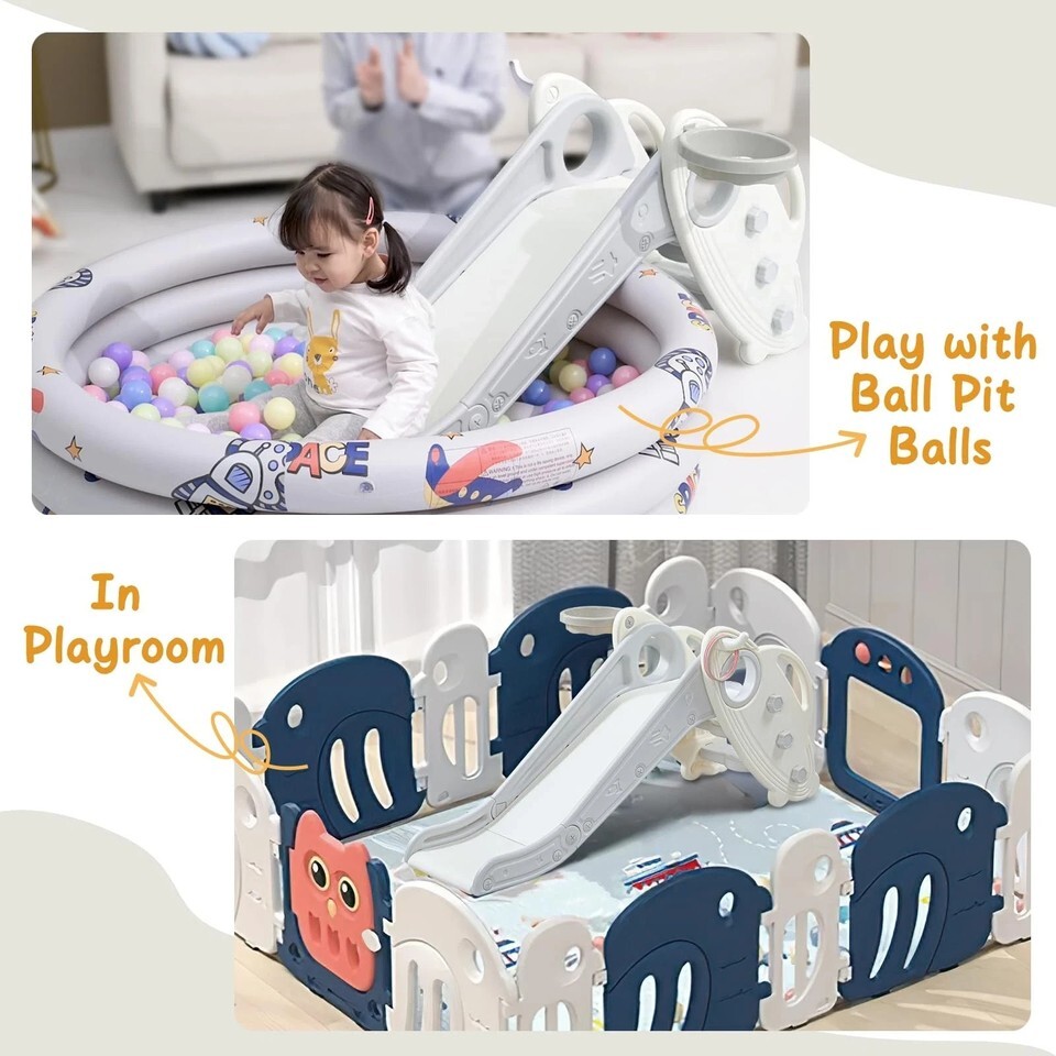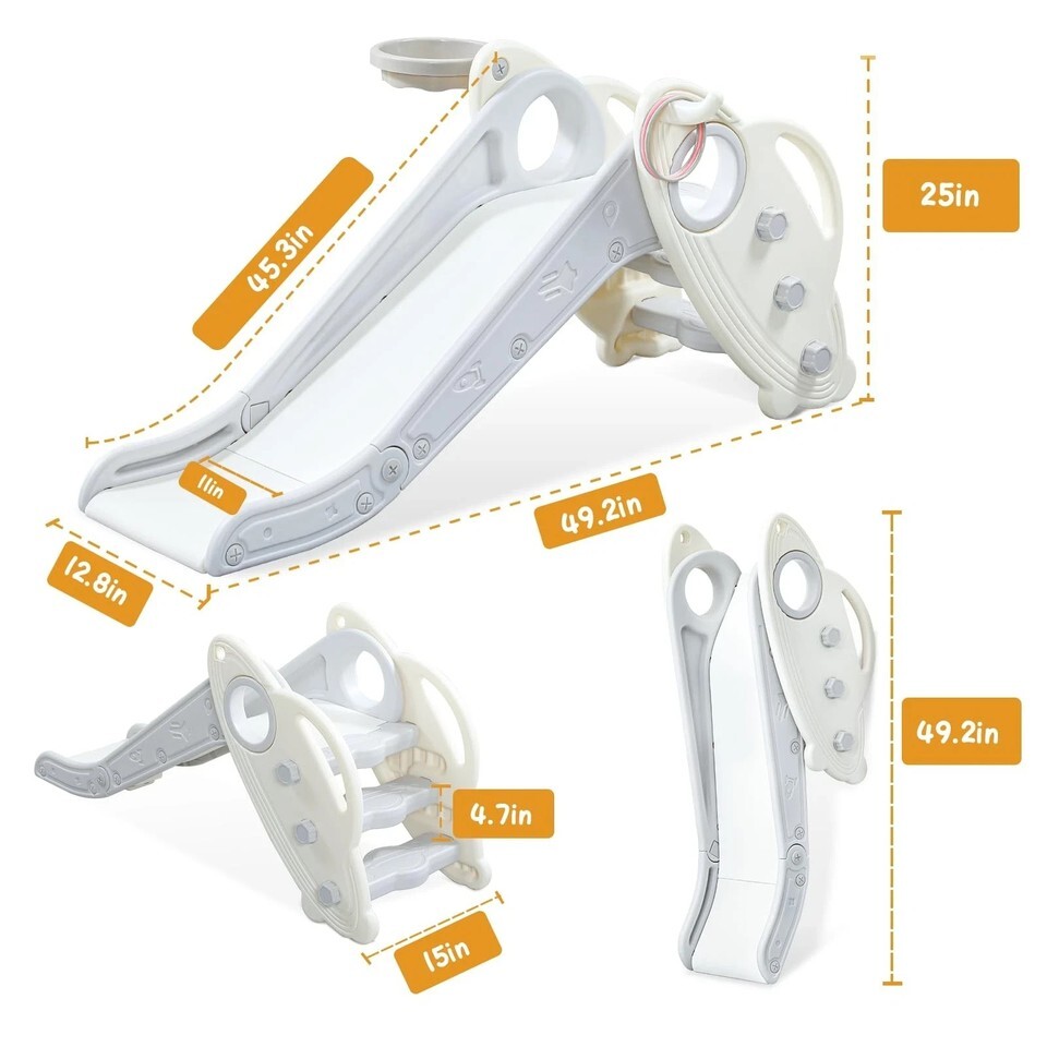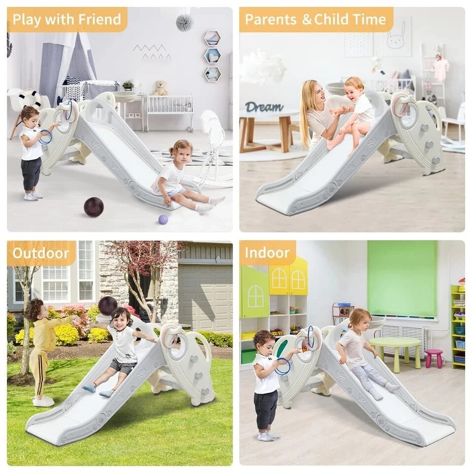 Climber+ Slide+ Ring Toss+ Basketball Games Playset - Our kid slide playset offers a variety of activities for toddlers. It features a basketball hoop, and a ring toss game for added fun. Whether used indoors or in the backyard, this playset provides an entertaining and safe playground for your little one. It is designed to enhance their playtime, allowing them to engage in sports, learn, and exercise while enjoying themselves.