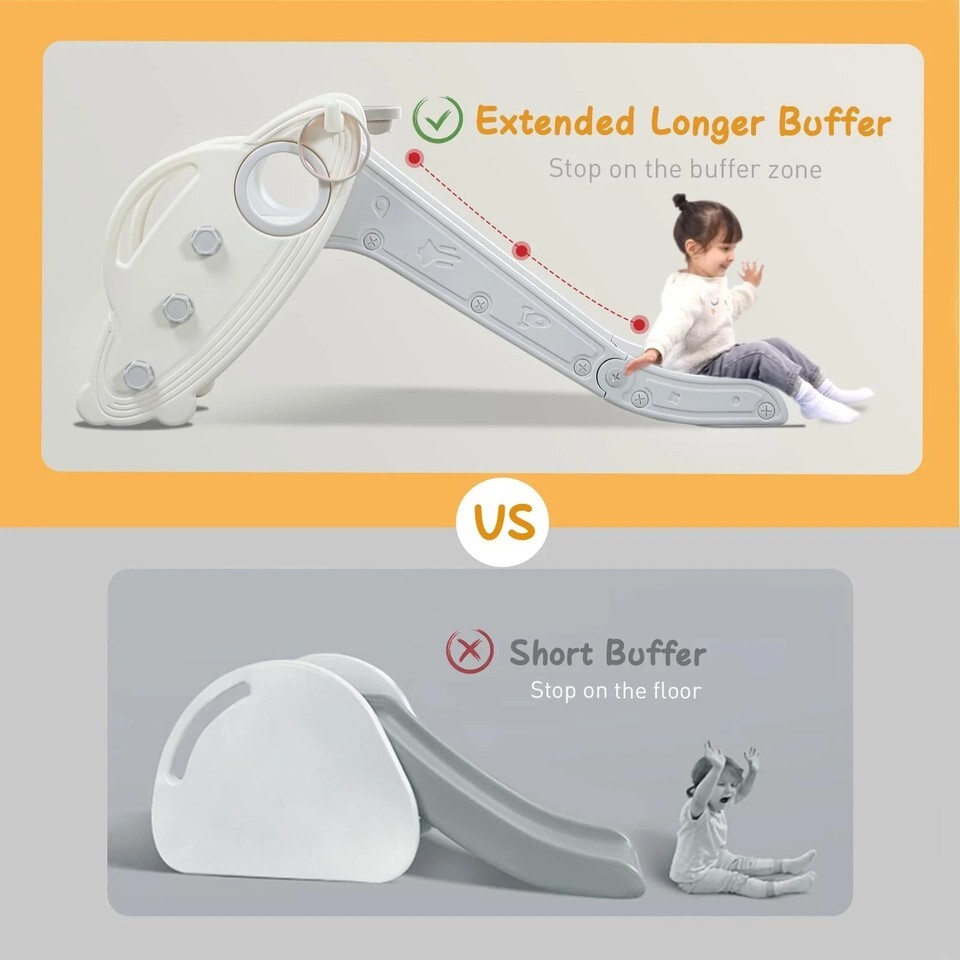 Careful Care for Babies and Toddlers - The handrail is designed to be easily gripped by little hands, ensuring their safety as they climb. The non-slip pedal is at a reasonable height, and the spacious waiting area offers a secure climbing experience. The end of the slide features an extra-long slippery slope with a buffer, ensuring a safe and controlled sliding experience. Kids will come to a stop in the buffer area instead of sliding onto the floor.