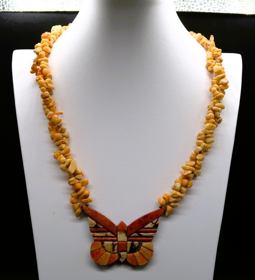 Vtg Beaded Necklace Butterfly Pendant Orange Hues Fashion Statement Jewelry