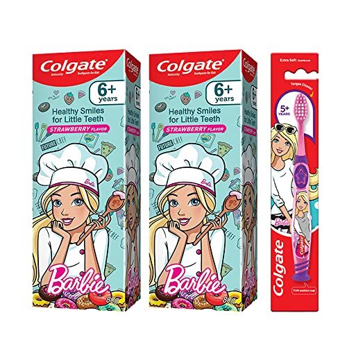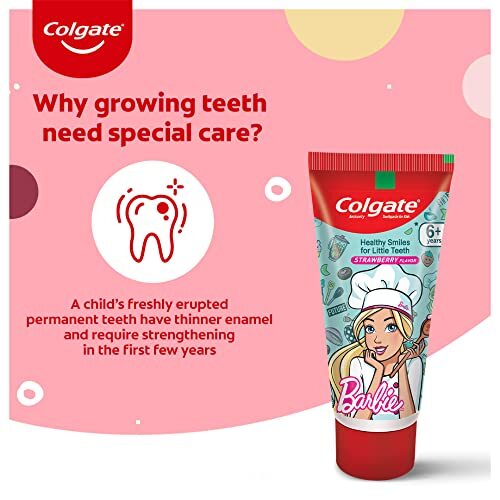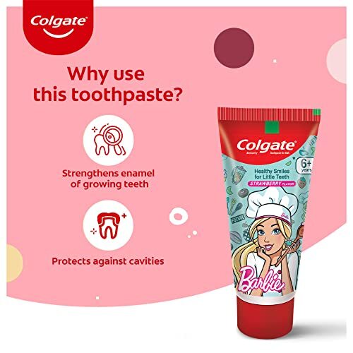 Product description: Kids must brush their teeth at least 2 times a day and Colgate Kids Barbie Toothpaste is a fun way to ensure they enjoy good oral care habits early on! This delicious fruit flavoured toothpaste is especially designed for children of age 6 years and above who have newly erupted or developing permanent teeth. The toothpaste effectively cleanses their mouth, leaving it fresh. The kid?s toothpaste also provides clinically proven cavity and enamel protection. Sparking colourful gel of Colgate strawberry toothpaste makes brushing fun for kids. Developed with the help and expertise of Pediatric dentists, Colgate offers a healthy and thorough clean. It ensures your kid?s smile gets brighter and cleaner with every use.