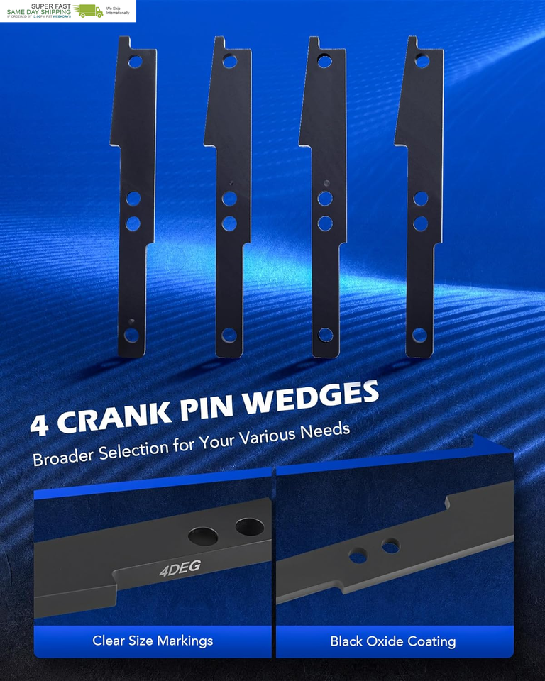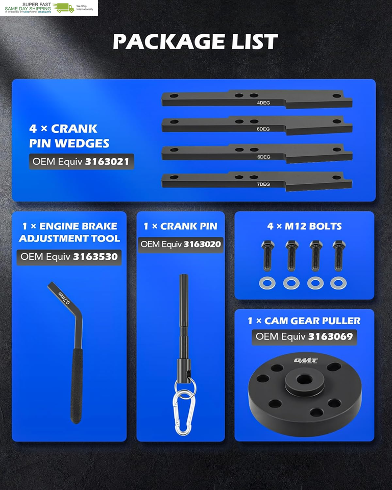 Comprehensive Set: Orion Motor Tech's 11-piece camshaft timing tool kit includes 4 crank pin wedges, a cam gear puller, a crank pin, an engine brake adjustment tool, and M12 bolts, making gear train timing and camshaft adjustments fast and easy