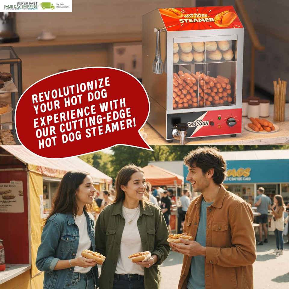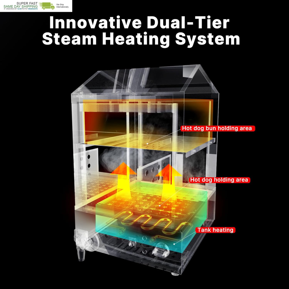 Innovative Dual-Tier Steam Heating System: By simply heating water, it generates a gentle, consistent flow of steam to work its magic. The lower tier serves as the ideal haven for your hot dogs, ensuring they're cooked evenly and infused with mouthwatering flavor. Meanwhile, the upper tier keeps your freshly baked buns warm and fluffy, ready to embrace the delicious sausages.