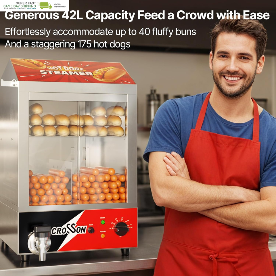 Generous 42L Capacity Feed a Crowd with Ease:effortlessly accommodate up to 40 fluffy buns in the upper tier and a staggering PRE-COOKED 175 hot dogs in the lower tier, ensuring you never run out of delicious options when hunger strikes.