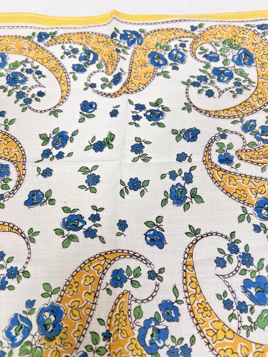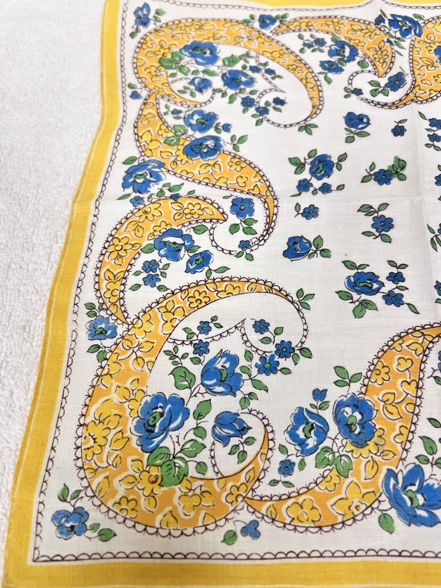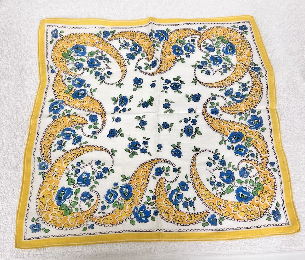 Vintage White Cotton Handkerchief Blue Floral Yellow Paisley Scroll Pattern Print Approx 13". Pretty blue flowers with yellow floral paisley scrolling pattern. No damage/tears, bright colors.