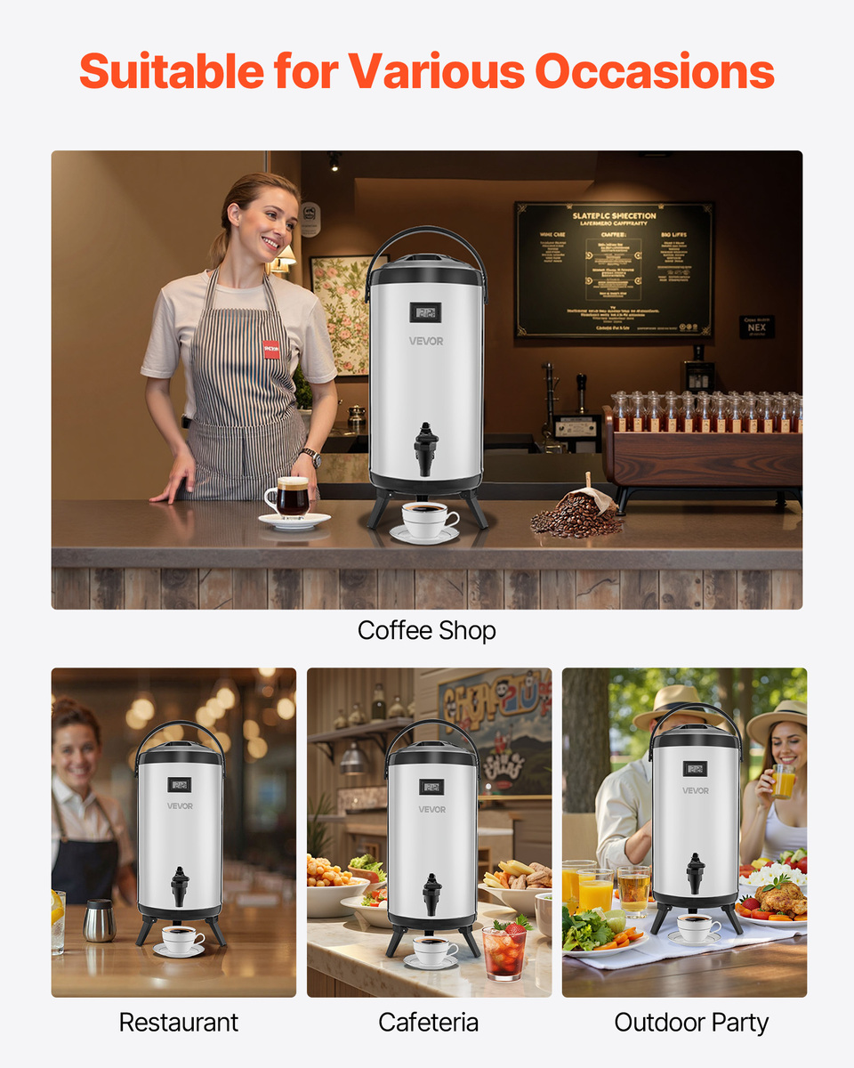 Real-Time Temperature Display: Built-in temperature display lets you monitor drinks in real-time, ensuring perfect hot or cold serving. Large capacity suits commercial use, making this insulated beverage dispenser ideal for busy beverage stations