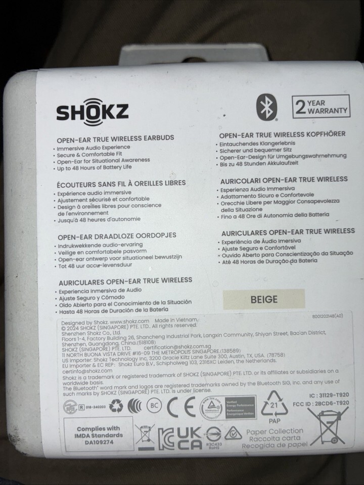 The BRAND New Shokz OpenFit 2 True Wireless Open-Ear Earphones - T920 are designed for runners with their ear-hook form factor and built-in microphone. These Bluetooth earphones come in a stylish beige color and include a charger for convenience. The SHOKZ brand ensures high-quality sound and comfort for an immersive listening experience while on the go. With a sleek design and advanced wireless technology, these earphones are perfect for those looking for a reliable and user-friendly audio solution for their active lifestyles.