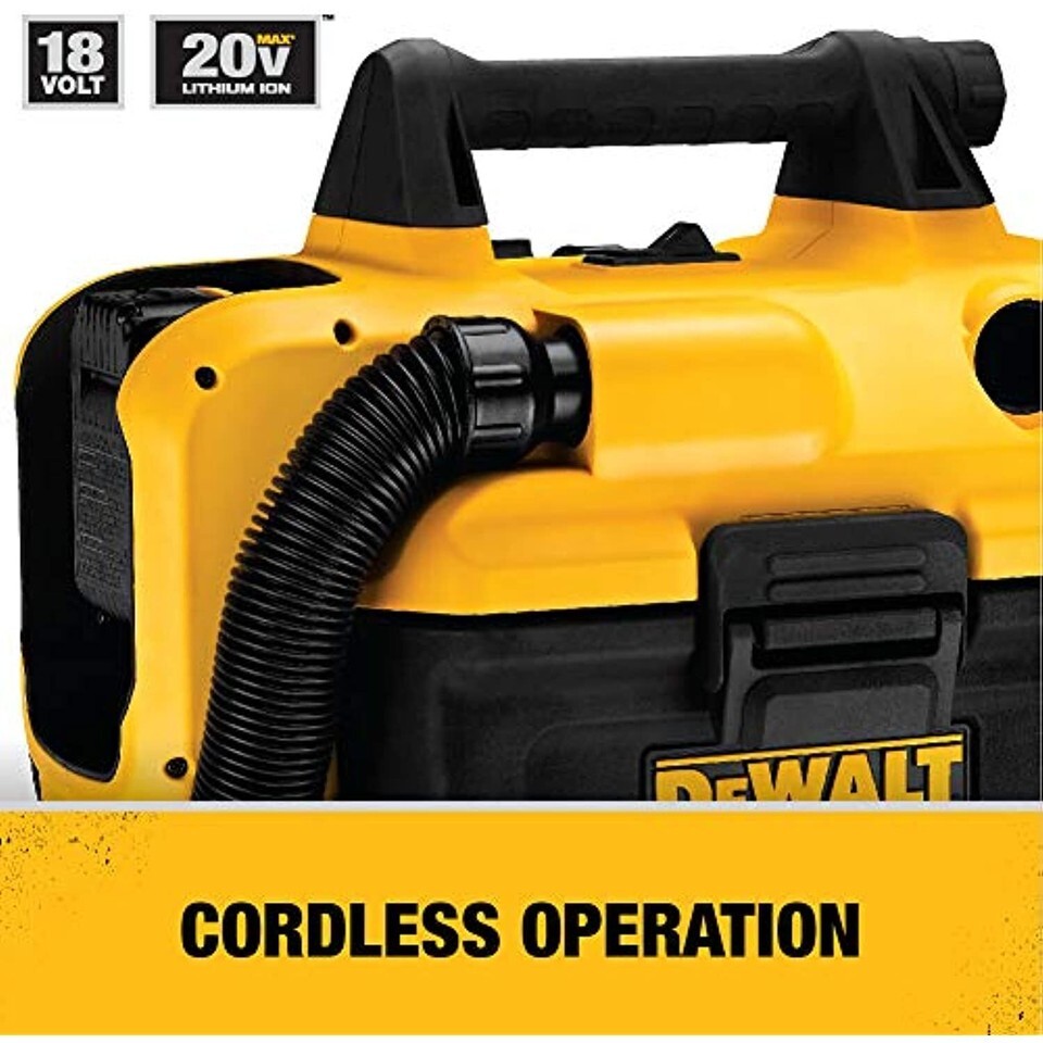 The DEWALT 20V MAX Cordless Wet-Dry Vacuum is designed for cordless operation powered by a 20V MAX battery. This unit features an easily accessible, washable/reusable filter; just simply use tap or water rinse to clean. A heavy-duty, crush-resistant, fully-integrated 5' (by 1-1/4" diameter) hose provides durability, flexibility and ease-of-use and the on-board hose and accessory storage makes the vacuum easy to carry/transport to use where ever you made need it. It also features a 2-Gallon tank capacity that provides enough storage to empty a toilet or clogged pipe. Common applications include: Wet or Dry Pickup and/or Blowing. Includes: (1) 5' Heavy-Duty Crush Resistant Hose (1-1/4" Diameter), (1) Crevice Tool Attachment, (1) Wide Nozzle Tool Attachment and (1) Filter. Battery Charger Sold Separately.
