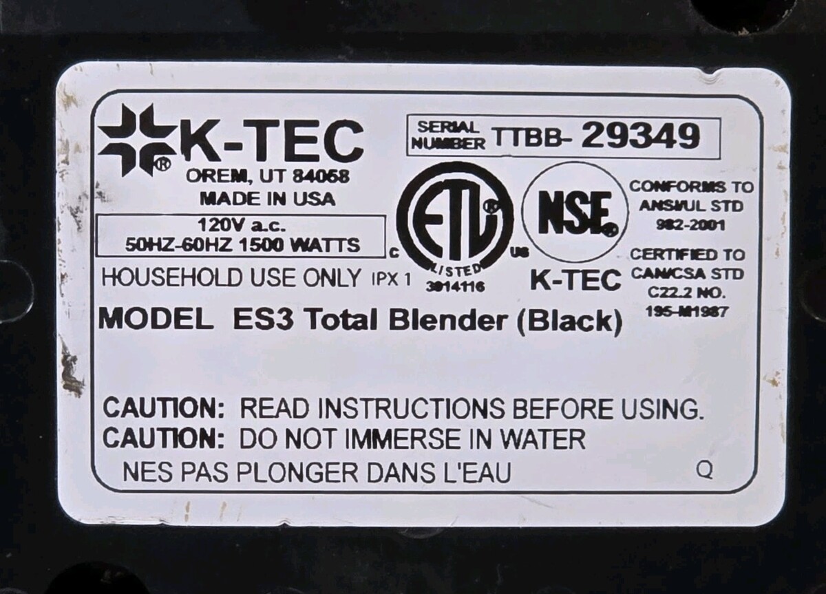 745 cycles. The Blendtec Total Blender Model ES3 is an electric blender with a capacity of 32 oz. It has five settings/programs and is tested to work. The blender comes with a pitcher and lid, and is black in color. The brand is Blendtec, and it is made in the United States. The blender has a power source of electric and a power of 1500 W. It is a countertop blender that is perfect for small kitchen appliances.