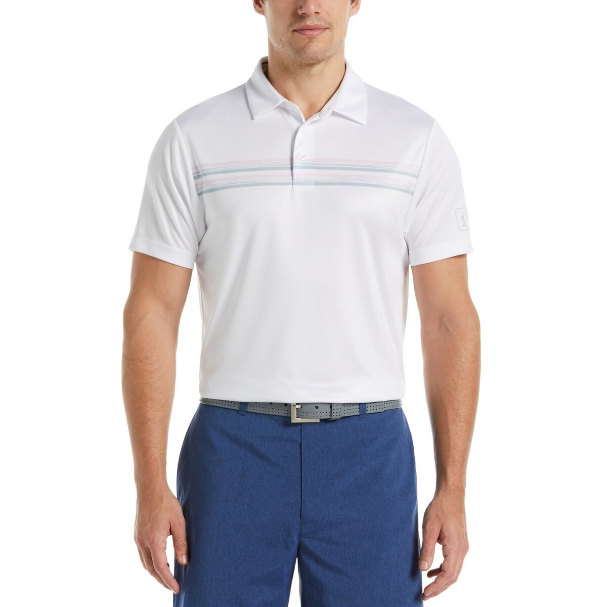 Stripes across the chest of this PGA TOUR APPAREL golf shirt add subtle eye-catching style to the classic polo. Built-in sun protection provides added peace of mind.Polo collar with button placketAIRFLUX ventilationWicking fabric helps evaporate moistureSun protectionPolyesterMachine washableImported