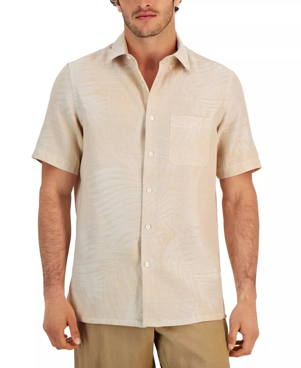 Club Room Men's Linen Blend Elevated Palm Jacquard Shirt Khaki Combo-Small