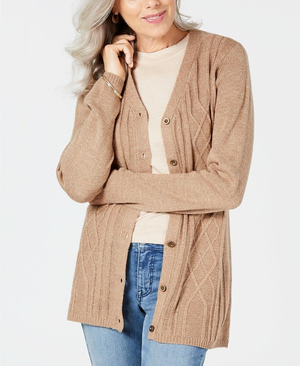 A collegiate classic for every woman's wardrobe, Karen Scott's petite cardigan boasts smart mixed knits and marled coloring.