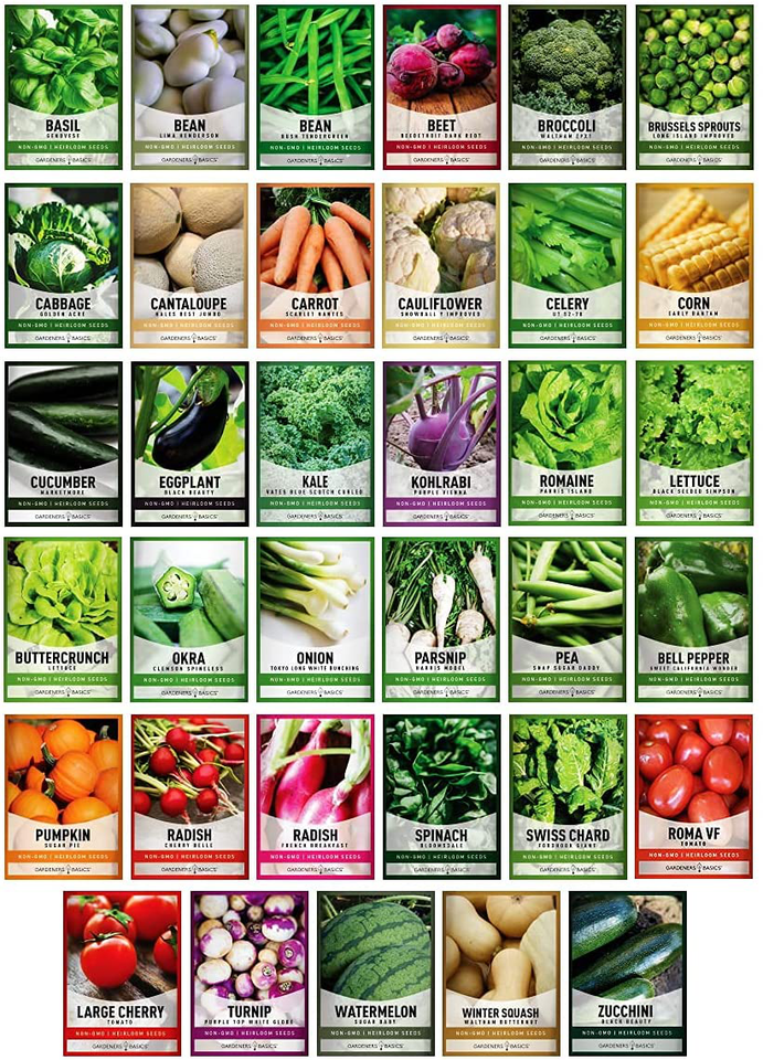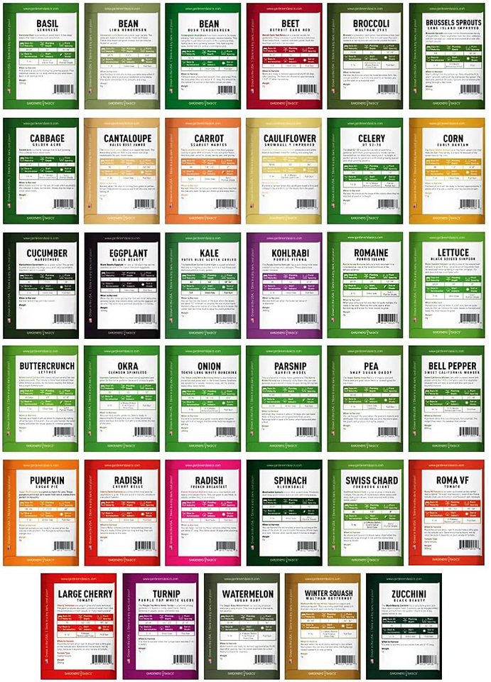 All garden seeds come in individual paper seed envelopes. Complete with instructions and growing guides for each plant. Paper seed packets are essential. Seeds stored in plastic baggies can let moisture in, cause mold and bacteria, thus rendering your seeds useless. Our seeds are proudly sourced and packaged in the USA. All seeds are heirloom, non gmo, non hybrid, and open pollinated. You can save seeds for future harvest. We've included a large variety of veg seeds! You can either have a complete garden or feel safe in your bugout bag survival kit, knowing you have all you need to grow a huge garden to feed yourself, family, neighbors, and more. Heirloom seeds make great gifts for that hard to buy person, garden enthusiast, retirees, survivalist, and more! 25 Year Shelf Life - Store seeds in a cool, dark place. Seeds are great for growing in containers, aquaponics, hydroponics, and vertical gardening. Type-Approximate Seed Count Basil-Genovese or Large Italian 150 Bean-Lima 25 Bean-Bush 20 Beet-Detroit Dark Red 180 Broccoli-Waltham 29x1 350 Brussel Sprouts-Long Island Improved 250 Cabbage-Golden or Red Acre 300 Cantelope-Hales Best Jumbo 50 Carrot-Scarlet Nantes 1800 Cauliflower-Snowball Y Improved 300 Celery-UT-52-70 3000 Corn-Early Bantam 50 Cucumber-Marketmore 50 Eggplant-Black Beauty 75 Kale-Bates Blue Scotch Curled 300 Kohlrabi-Purple Vienna 75 Lettuce-Romaine 2300 Looseleaf Lettuce-Black Seeded Simpson 2300 Bibb Lettuce-Butterhead Buttercrunch 2300 Okra-Clemson Spineless 50 Onion-Bunching Tokyo Long White 250 Parsnip-Harris Model 250 Pea-Snap Sugar Daddy 25 Pepper-California Wonder 100 Pumpkin-Sugar Pie 15 Radish-Cherry Belle 200 Radish-French Breakfast 300 Spinach-Bloomsdale or Viroflay 125 Swiss Chard-Fordhook Giant 100 Paste Tomato-Roma VF or San Marzano 180 Tomato-Large Cherry 100 Turnip-Purple Top White Globe 500 Watermelon-Sugar Baby 35 Winter Squash-Waltham Butternut 25 Zucchini-Black Beauty 25