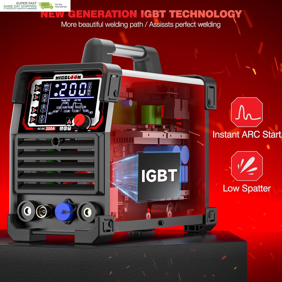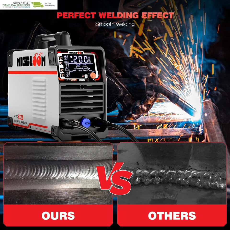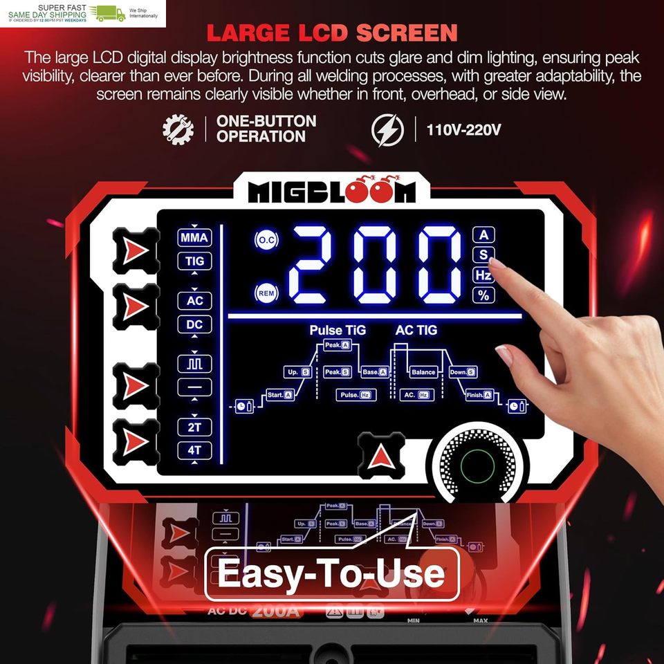 User-Friendly Operating Interface: TIG Wedler AC DC 200 Amp has a large LCD display screen allowing you to finely adjust welding parameters with exceptional precision. The welder precisely adjusts base current, peak current, arc start/end, pulse frequency, pulse width, and cleaning width to achieve perfect welding