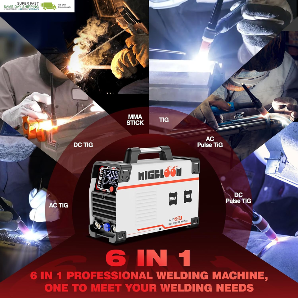 6-in-1 Welding Modes: AC DC TIG welder 200Amp integrates 6 welding modes, including MMA STICK/TIG/AC TIG/DC TIG/AC Pulse TIG/DC Pulse TlG. Whether high-precision DC welding or complex workpiece AC pulse welding, this welding machine meets your needs