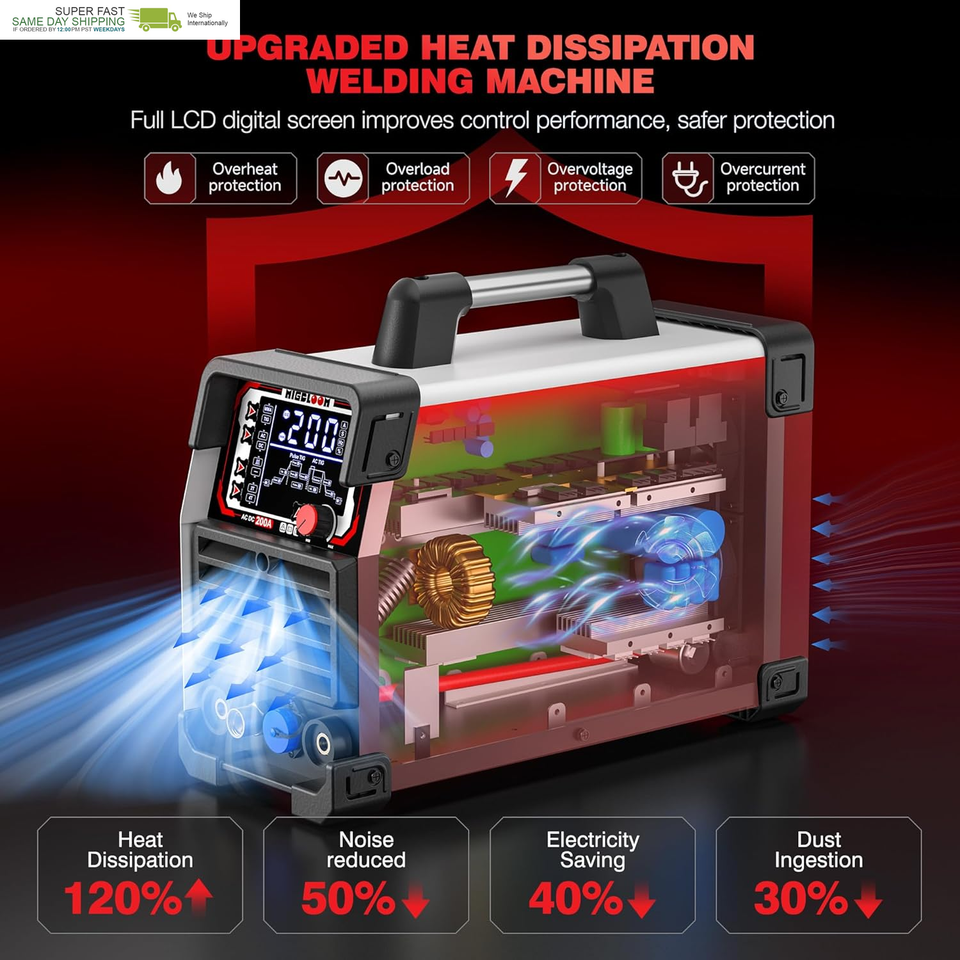 Advanced Inverter Technology : This welding machine employs the latest full-bridge soft-switching inverter technology, significantly enhancing welding efficiency compared to traditional welding equipment. It also boasts a smaller size and lighter weight, making it easier to carry and store. Weighing just 7.4 kg (16.28 lbs), it effortlessly adapts to both workshop and mobile environments