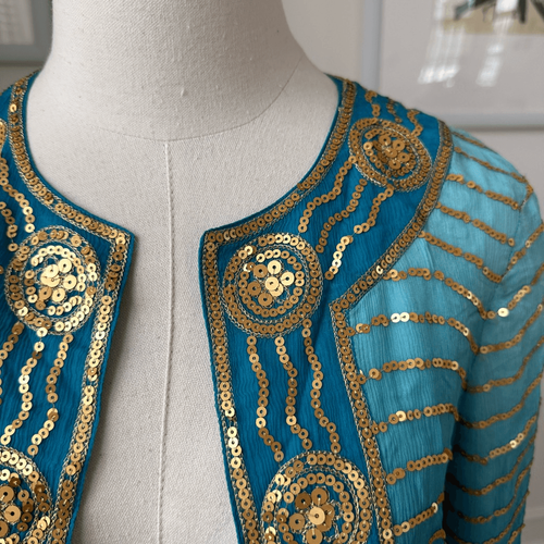 Trina Turk, 100% silk voile round neck open front cropped bolero style jacket with gold sequin detailing throughout. The placket and the round neck is heavily decorated with patterned sequins, with light striping throughout the balance. No noted flaws. Turquoise blue and gold. Lovely for special occasions but would also elevate basic jeans and tank top for a quick throw on and go style. So pretty. Laying flat measures 19 inches shoulder to hem and 17 inches armpit to armpit with the open seam touching. It is featured on my size Small dress form where it fits well. Tag size 0.