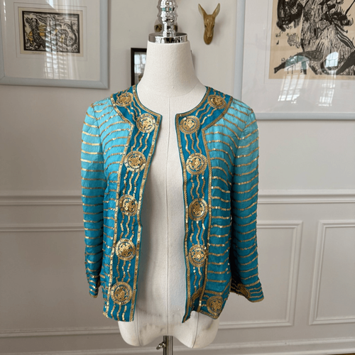Trina Turk Turquoise Blue 100% Silk Gold Sequin Bolero Jacket 0 XS S