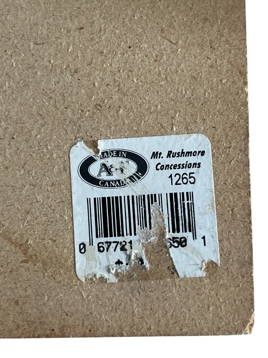 Decorative Mount Rushmore wall plaque featuring a raised metal eagle figure mounted on a woodgrain-finish plaque. The piece includes a framed Mount Rushmore image with ornate metal-look trim and a small hanging loop on the back for wall display. Labeled ?Mount Rushmore? on the front. Original souvenir piece produced for Mount Rushmore concessions and marked Made in Canada on the back label.