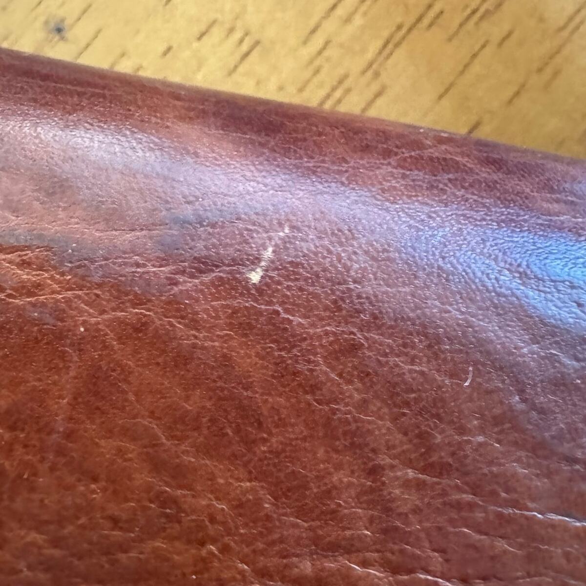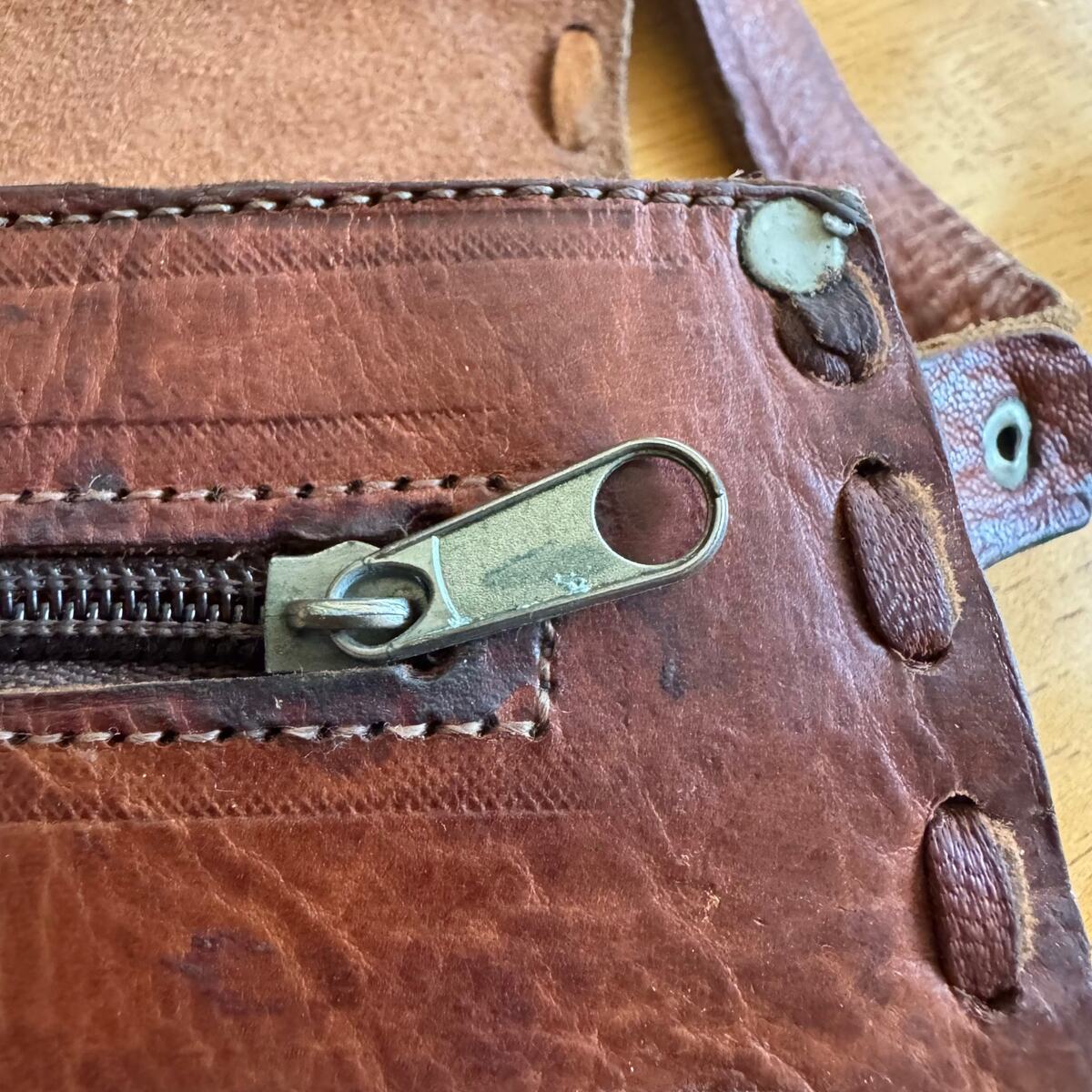flap is fastened down with a leather loop, inside is a small zipper compartment on the outside of the main compartment